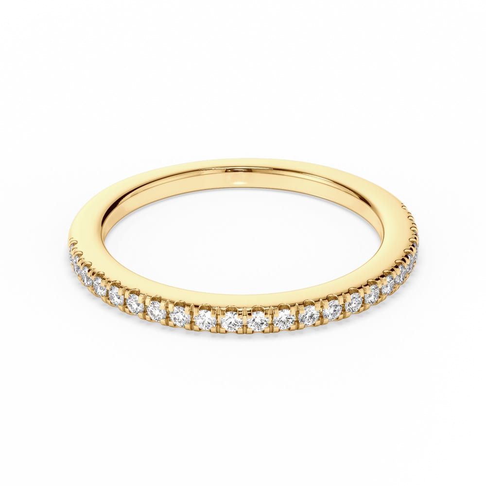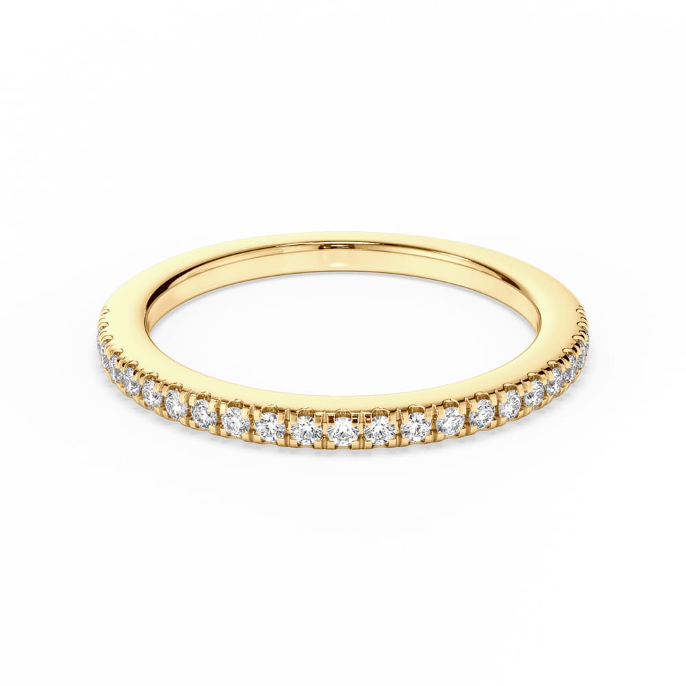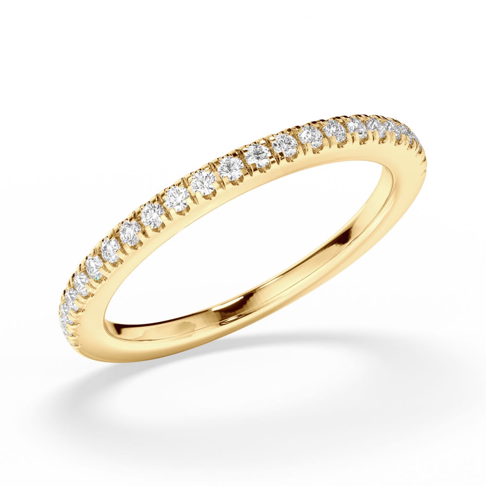 Delicate and timeless, this elegant ladies wedding ring is handcrafted in 18ct yellow gold and adorned with 0.20ct of brilliant cut mined diamonds. Each diamond is claw set to capture maximum brilliance and light, while the slender 2mm wide-polished band offers a refined and graceful finish. Expertly designed by Robert Cliff Master Jewellers.