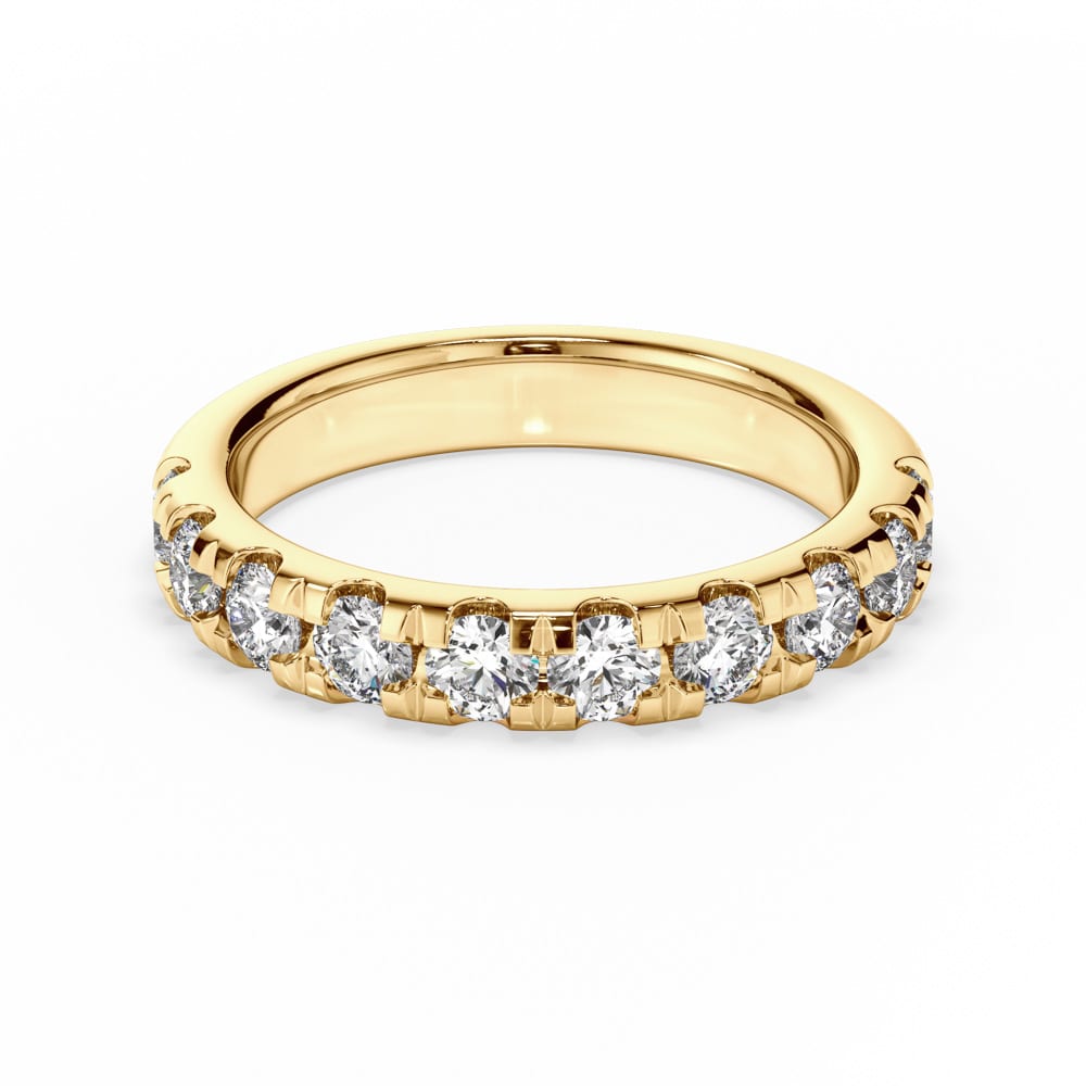 An exquisite wedding ring handcrafted in 18ct yellow gold, adorned with a sparkling row of 1.0ct claw-set brilliant cut mined diamonds shimmering across the top half of the band. The rounded band is polished to a radiant high shine, creating the perfect blend of timeless elegance and modern sophistication. Designed with expert craftsmanship by Robert Cliff Master Jewellers.