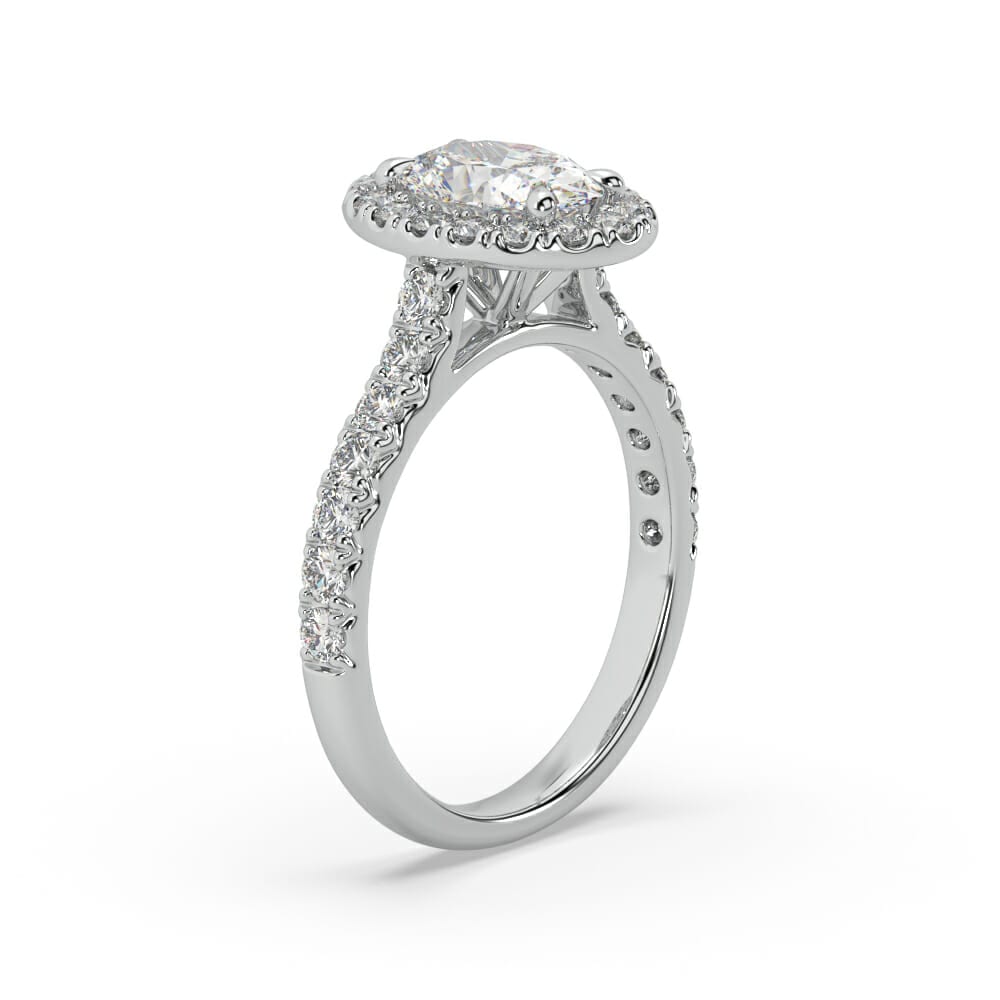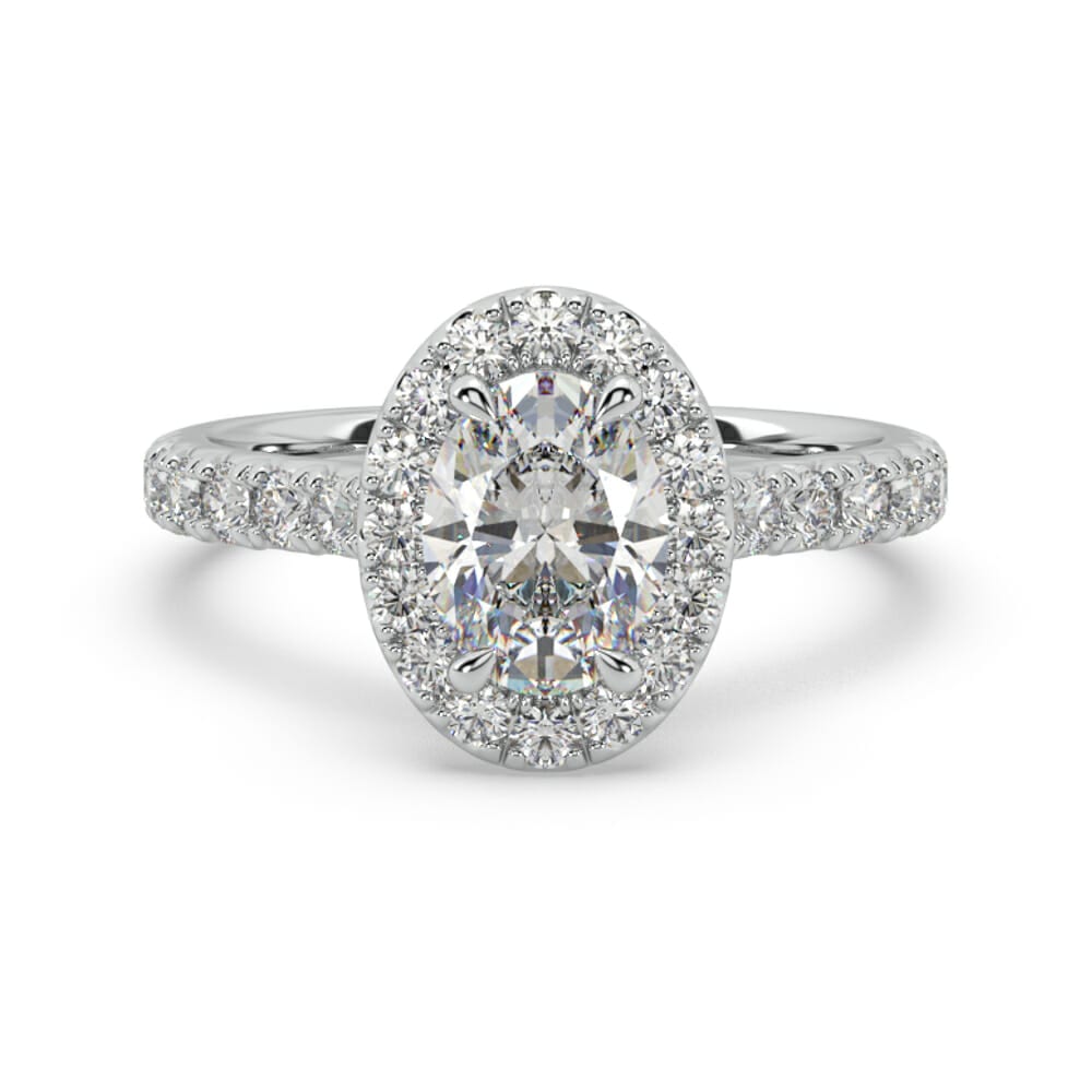 \nFeatured at the centre of the design is a four claw-set oval cut laboratory-grown diamond, radiating brilliance and elegance. Encircling the centre stone is a delicate halo of micro claw-set brilliant cut mined diamonds, enhancing its sparkle and adding dimensional beauty. The high polished 2.00mm band is also claw set with brilliant cut mined diamonds, offering added light and detail from every angle.
