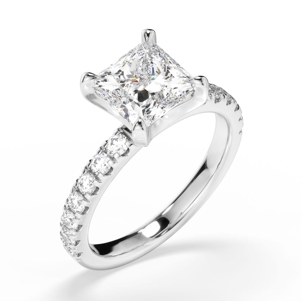 Elegant and full of sparkle, this 18ct white gold engagement ring features a princess cut mined diamond in a classic four claw setting. Accentuating the design, the band is claw set with brilliant cut mined diamonds, enhancing its brilliance and timeless charm.\n\nExpertly crafted by Robert Cliff Master Jewellers.