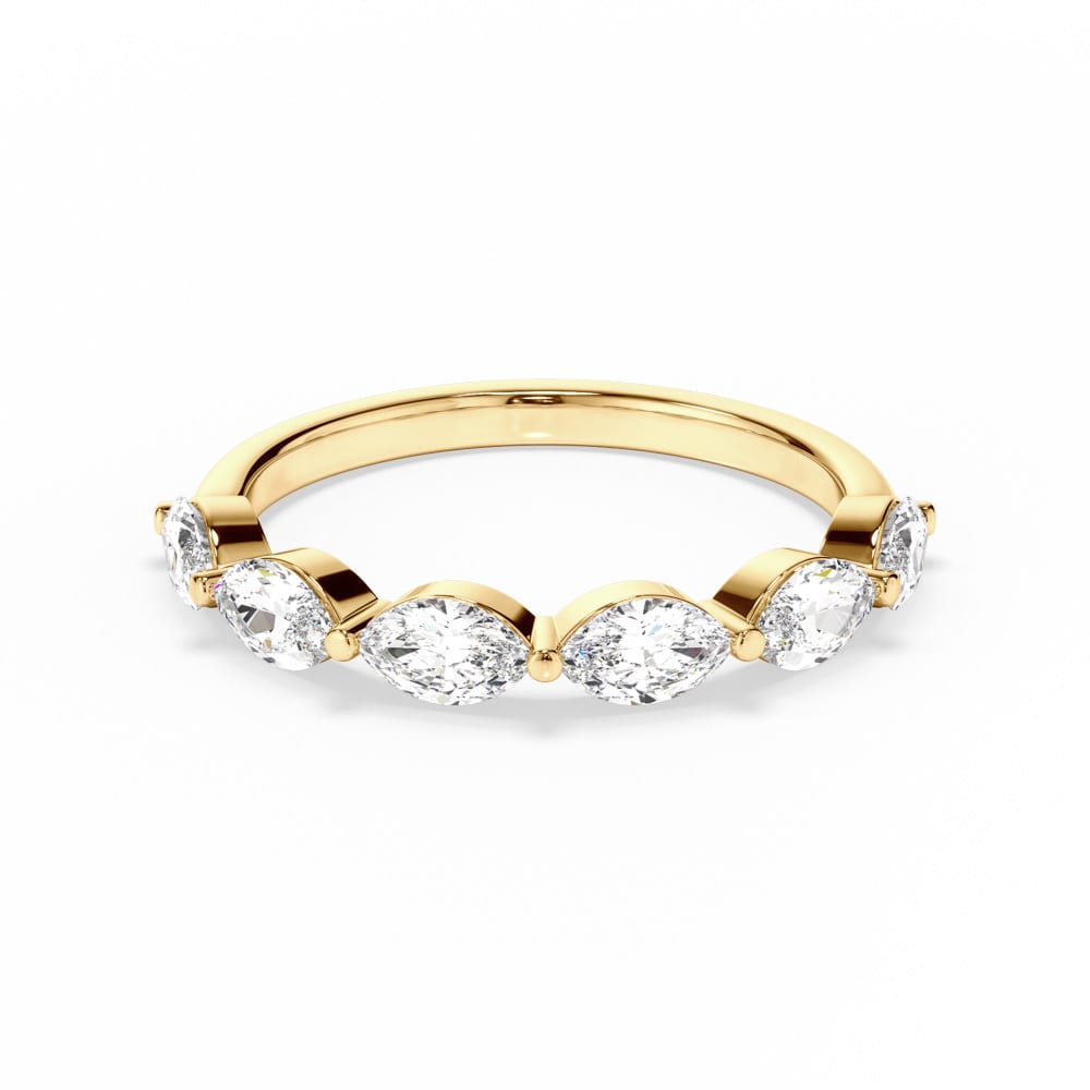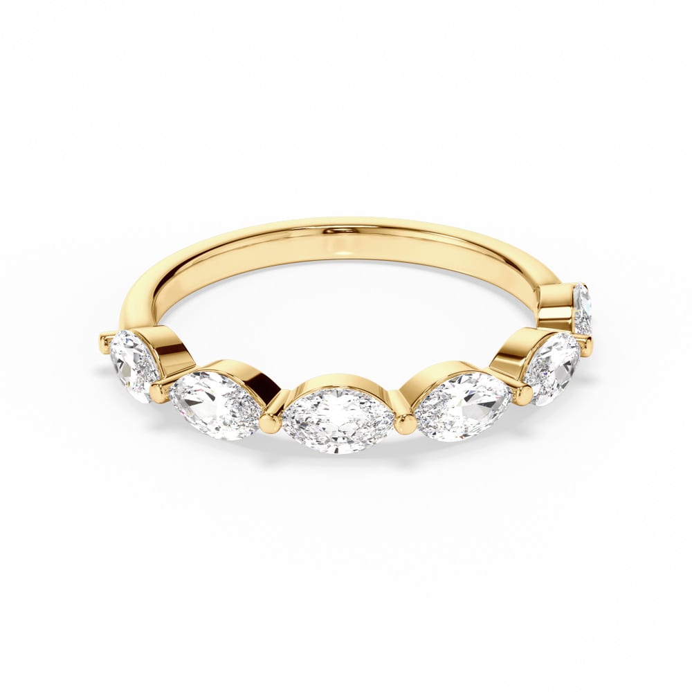 An elegant take on modern design, this 18ct yellow gold ladies wedding ring features marquise cut mined diamonds, each set sideways to create a distinctive linear sparkle. The slender 1.8mm wide band is finished with a radiant high polish, offering a sleek and refined touch. Handcrafted with precision by Robert Cliff Master Jewellers.