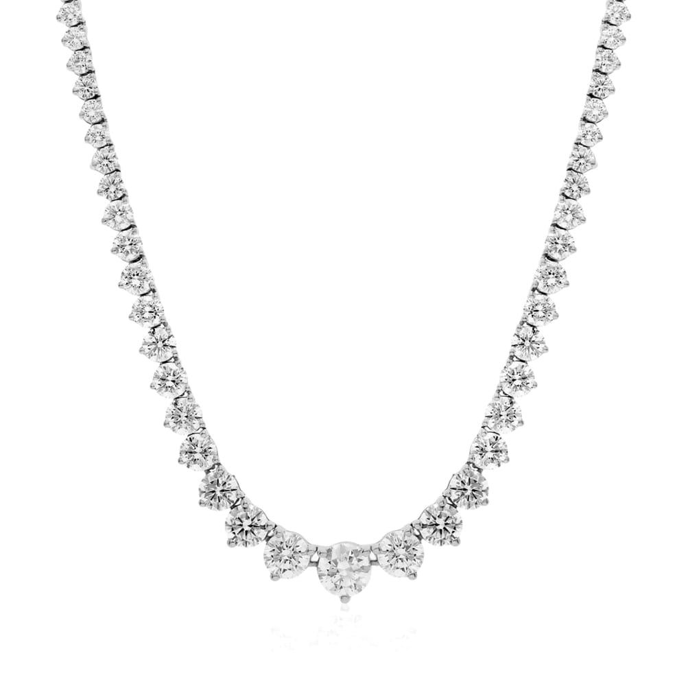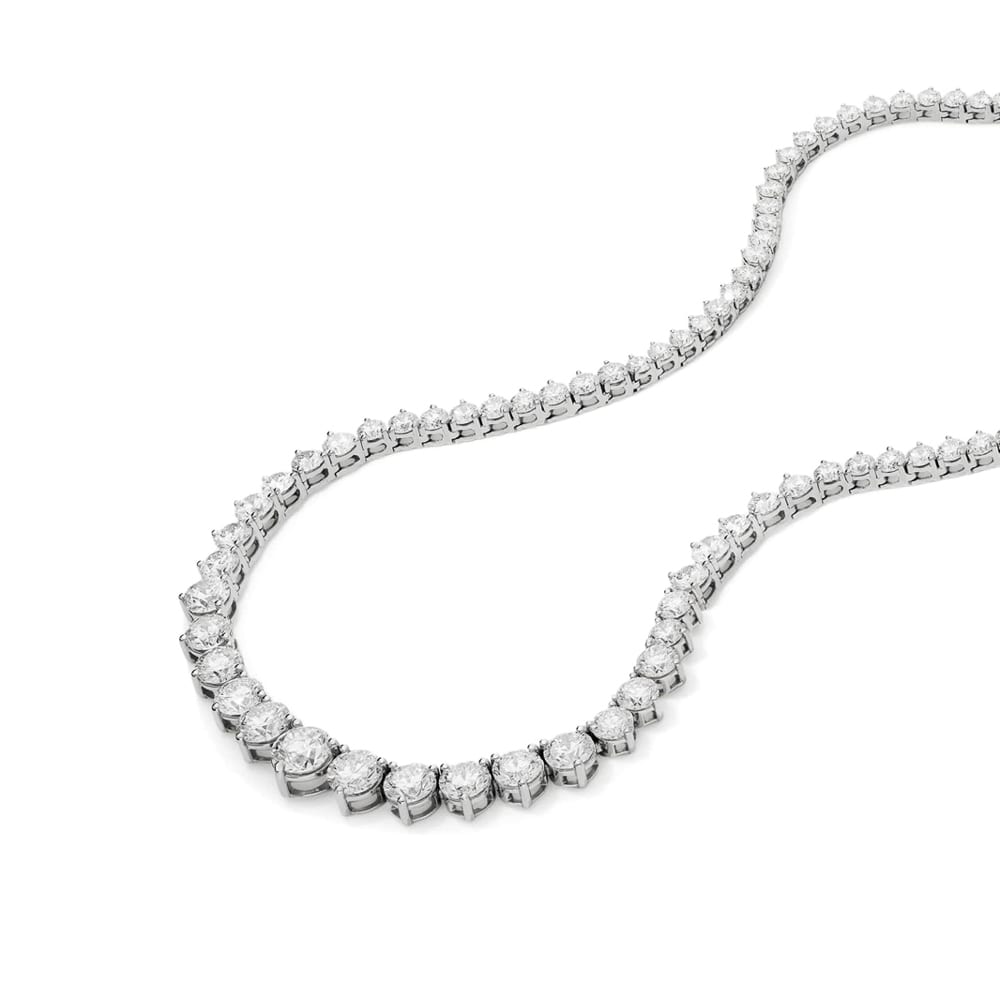 One 14ct white gold graduated diamond tennis necklace. Elegantly crafted, this exquisite piece showcases a seamless flow of graduated brilliant cut laboratory grown diamonds, totalling 7.25ct. Each diamond is meticulously secured in refined three-claw settings, forming a timeless silhouette measuring 45cm in length. The necklace is finished with a discreet box clasp and dual figure-eight safety clasps for added security. A sophisticated design, masterfully created by Robert Cliff Master Jewellers.