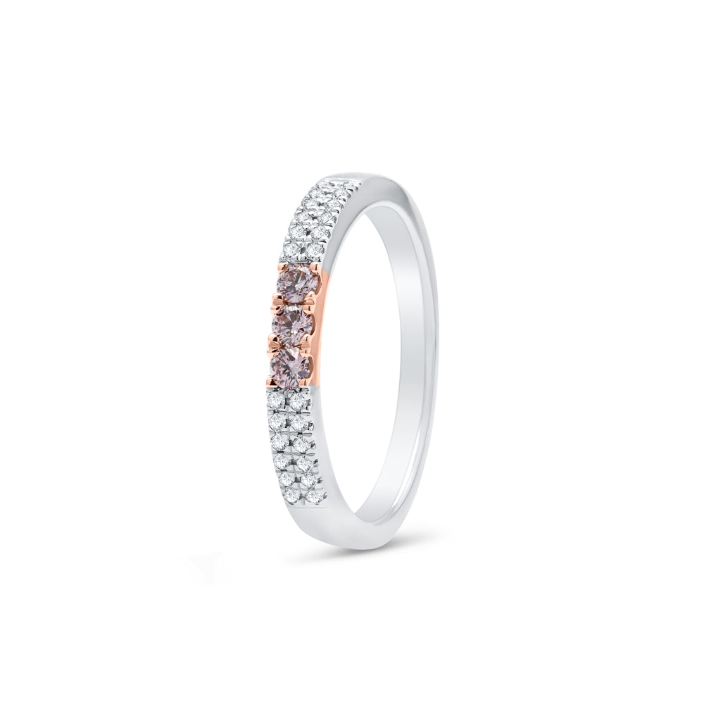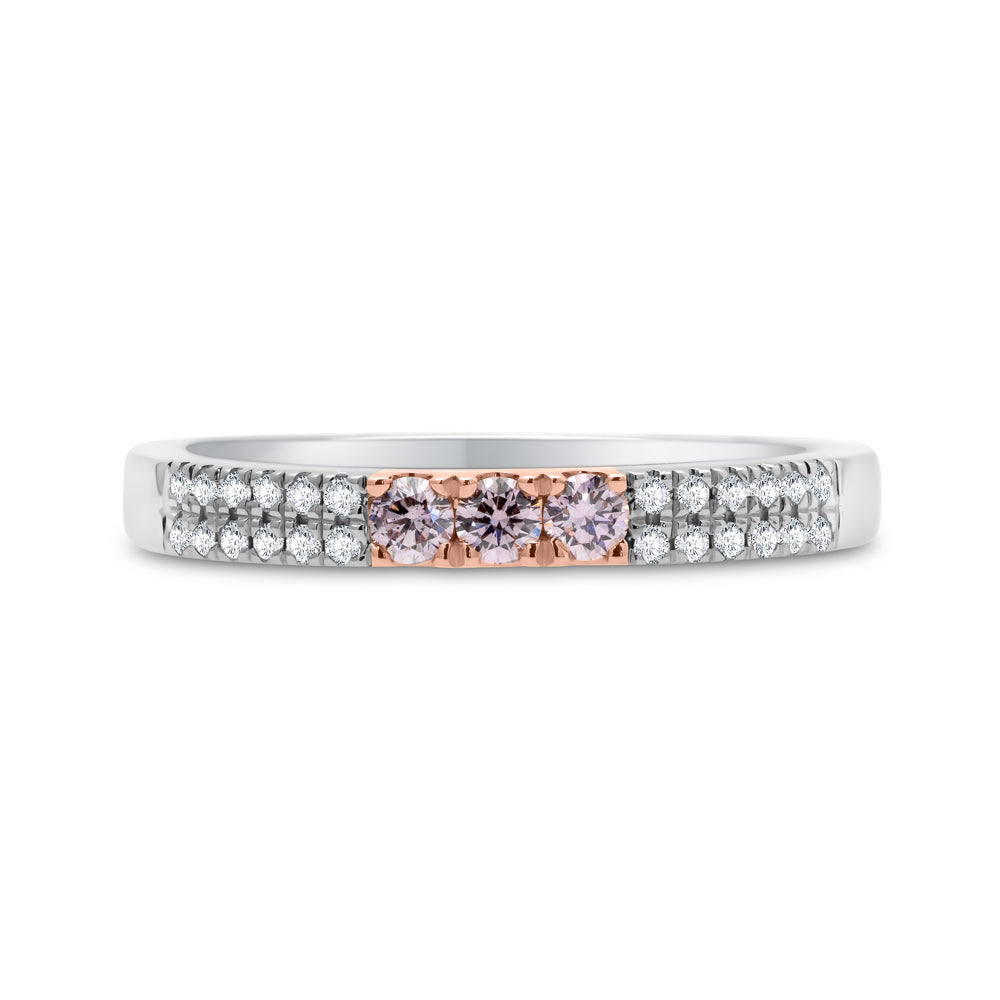 This exquisite 18ct rose and white gold ring showcases the rare beauty of Argyle pink diamonds paired with the brilliance of white diamonds. At the heart of the design are three rose gold claw-set brilliant-cut Argyle pink diamonds, radiating soft blush tones. Enhancing their beauty, brilliant-cut mined white diamonds are claw-set along each side of the centre stones and continue down the rounded, high-polished band.