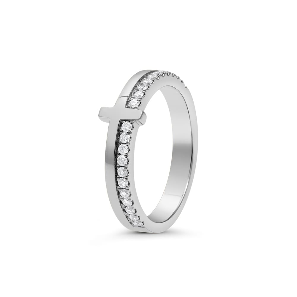 Crafted in radiant 18ct white gold, this modern diamond cross ring features a row of micro claw-set brilliant cut diamonds set along one side of the band, creating a subtle yet striking asymmetrical sparkle. The high-polished finish enhances the ring’s sleek, minimalist design, making it a perfect piece for layering or everyday wear with symbolic elegance.