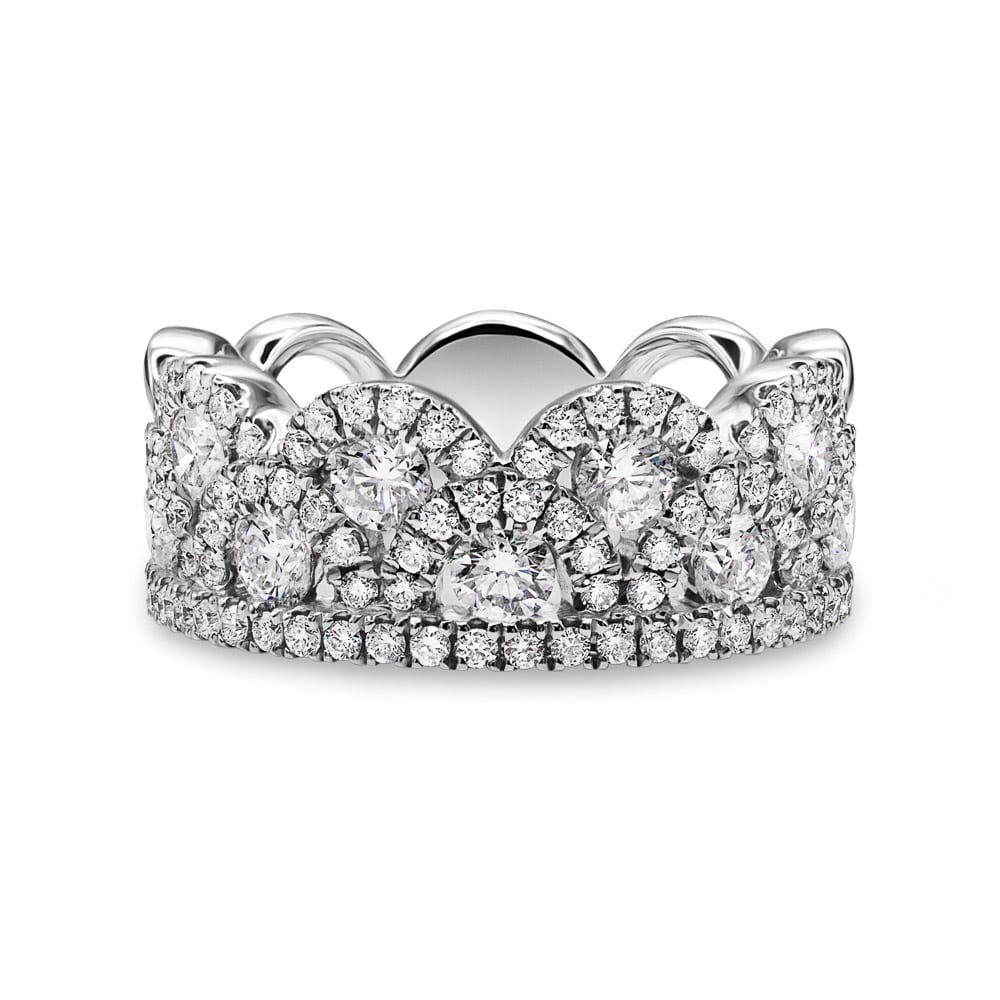 Fit for royalty, this 18ct white gold crown ring showcases a graceful arrangement of claw-set brilliant cut mined diamonds in a charming crown silhouette. A straight row of brilliant cut diamonds forms the base of the design, with the sparkle extending halfway around the band. Finished in high-polished white gold, this ring blends elegance and symbolism—perfect as a statement piece, a romantic gift..