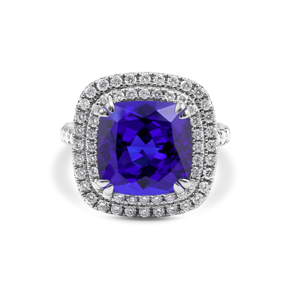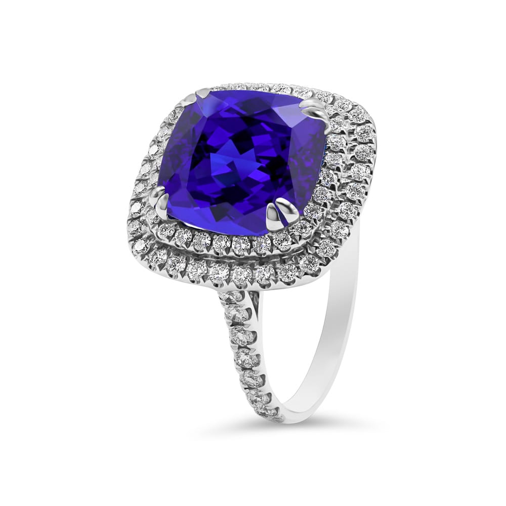 Exquisitely crafted by Robert Cliff Master Jewellers, this 18ct white gold double halo ring features a breathtaking 7.33ct tanzanite as its captivating centrepiece. Surrounding the gem are two shimmering halos of brilliant-cut mined diamonds, enhancing the tanzanite’s vivid colour and remarkable depth.\nThe high-polished white gold band is also claw-set with brilliant-cut diamonds, adding continuous sparkle and refined elegance.