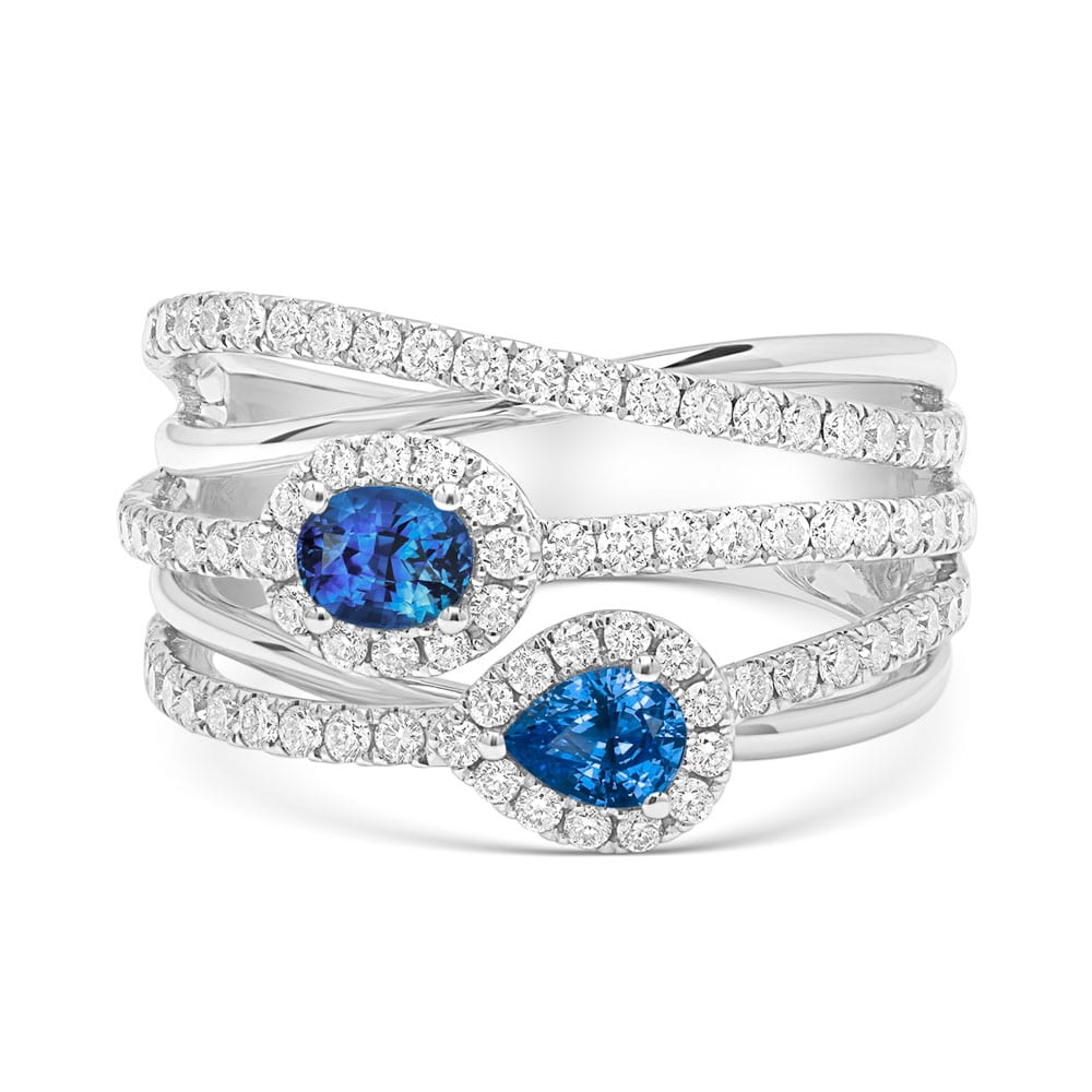 Bold and elegant, this 18ct white gold dress ring features a striking oval blue sapphire and a pear-shaped blue sapphire at its centre, each framed by round brilliant cut diamonds. The design flows into five sweeping swirls — two in sleek high polish and three adorned with shimmering round brilliant cut diamonds — with the sapphires set upon the diamond-set swirls for added brilliance. The wide, high-polished band completes this luxurious piece, masterfully crafted by Robert Cliff Master Jewellers.