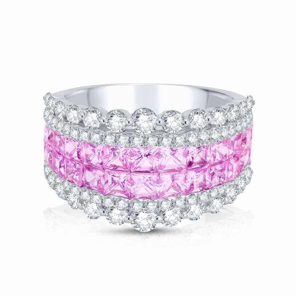 Crafted in luxurious 18ct white gold, this royal-inspired ring showcases a double row of square cut princess pink sapphires, invisibly set across the centre for a seamless display of vibrant colour. Framing the sapphires on either side are floral crown-like clusters of claw-set brilliant cut mined diamonds, bringing balance and brilliance to the design. With gemstones extending halfway around the band and a softly rounded, high-polished base, this statement ring is a bold celebration of elegance, femininity, and regal charm—perfect for those who love standout pieces with timeless beauty.