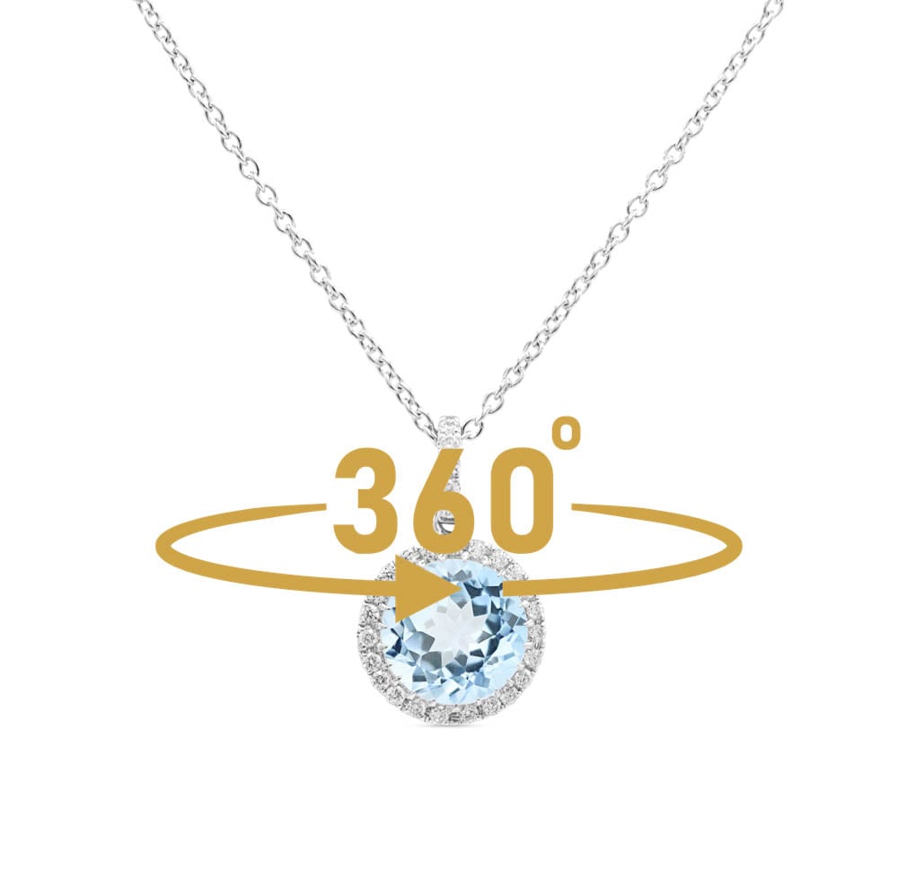 Elegant and timeless, this 18ct white gold necklace features a soft blue round cut aquamarine, held in a four-claw setting at the heart of the pendant. A delicate halo of micro claw-set brilliant cut mined diamonds surrounds the centre stone, enhancing its natural brilliance and adding refined sparkle. Paired with a 45cm trace chain and a secure parrot clasp, this necklace is the perfect choice for everyday or a meaningful gift.\n\n