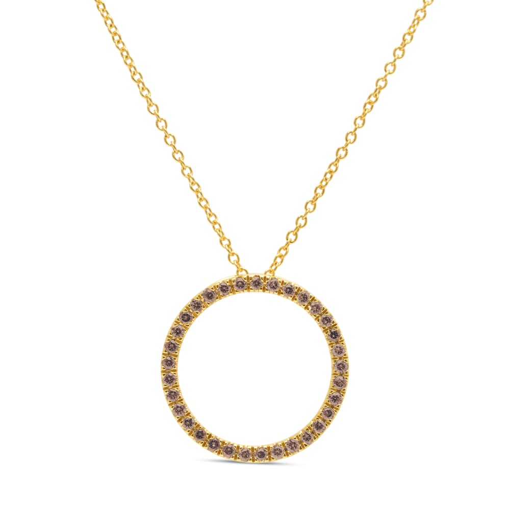 Crafted in 18ct yellow gold, this elegant circle slider pendant is adorned with brilliant cut champagne diamonds, radiating warmth and sparkle. Suspended on a matching yellow gold chain, this timeless design is a symbol of elegance and meaning. Designed exclusively by Robert Cliff Master Jewellers.