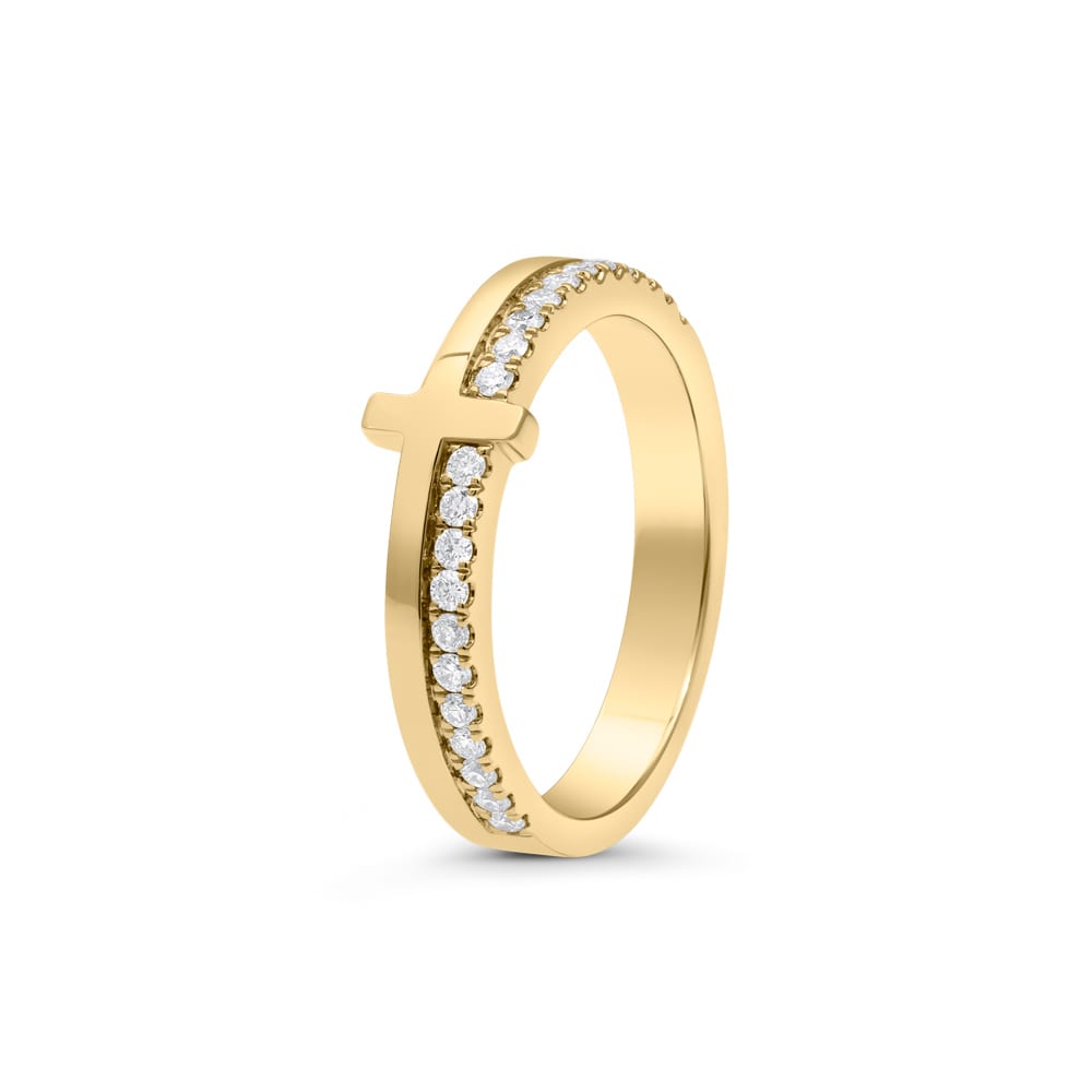 Crafted in radiant 18ct yellow gold, this modern diamond cross ring features a row of micro claw-set brilliant cut diamonds set along one side of the band, creating a subtle yet striking asymmetrical sparkle. The high-polished finish enhances the ring’s sleek, minimalist design, making it a perfect piece for layering or everyday wear with symbolic elegance.