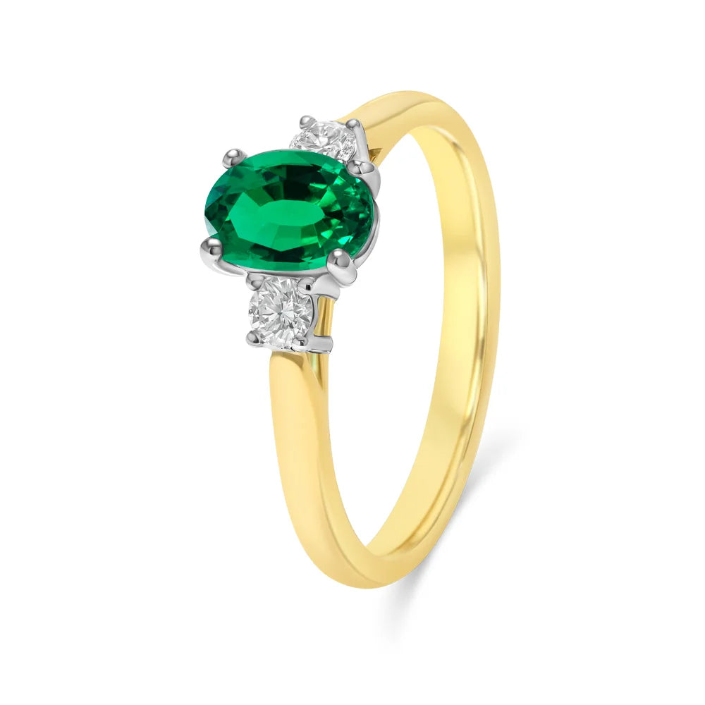 Crafted in 18ct yellow gold, this elegant ring features a four-claw set oval emerald weighing 1.05ct, flanked by brilliant cut mined diamonds totalling 0.18ct. The polished yellow gold band provides a timeless setting that highlights the vivid green centre stone. Handcrafted by Robert Cliff Master Jewellers.