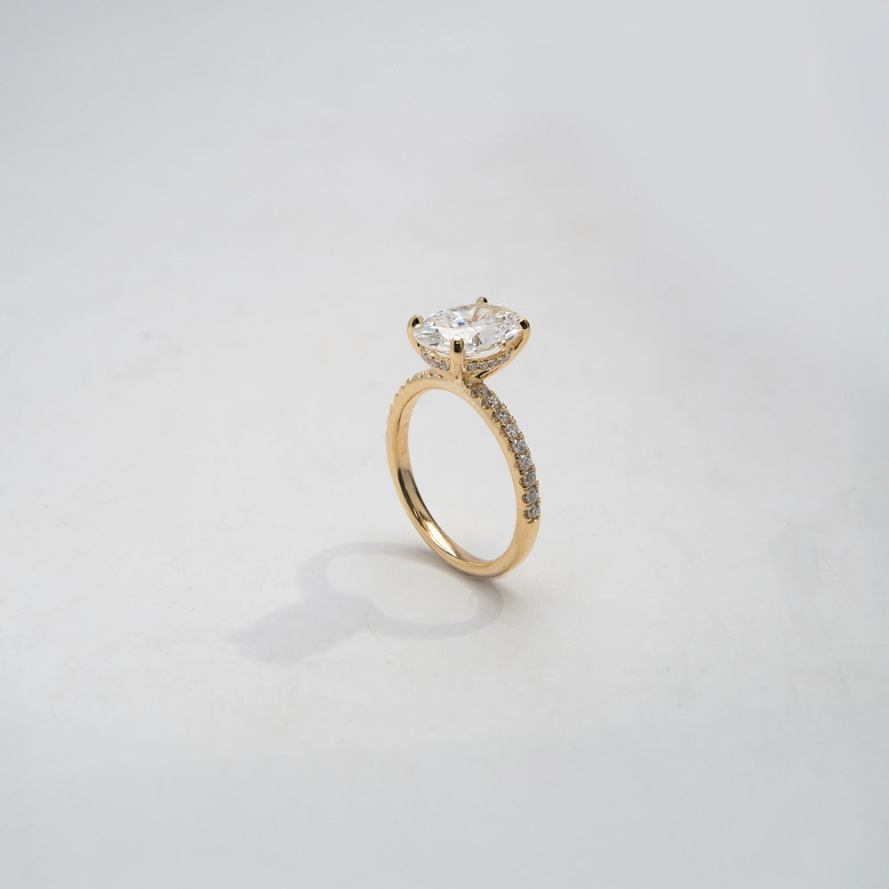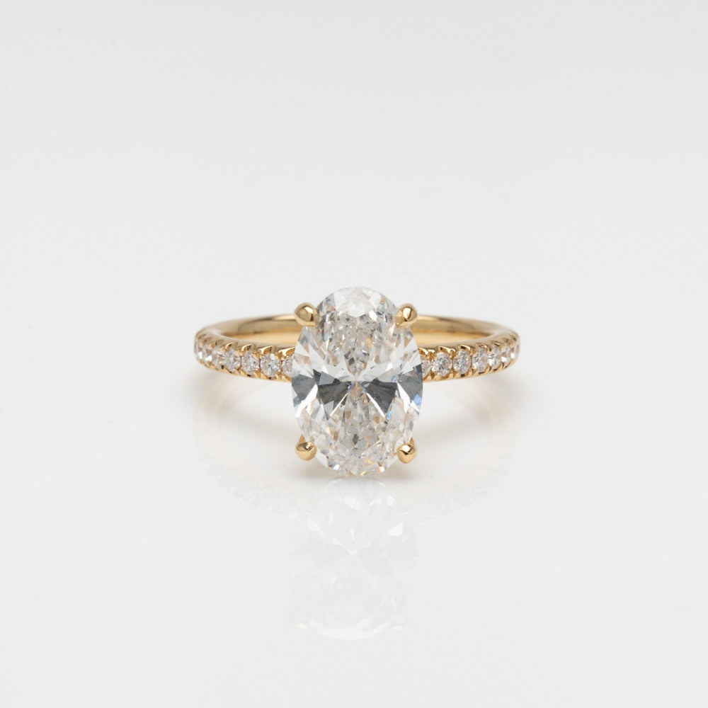 One 18ct yellow gold engagement ring featuring an oval cut laboratory-grown diamond held in an elegant claw setting. Beneath the centre stone is a refined hidden halo, adding brilliance from every angle. The shoulders are accented with brilliant cut mined diamonds totalling 0.28ct, claw-set along the band to create continuous sparkle. Finished in high-polished 18ct yellow gold, this ring is crafted with precision by Robert Cliff Master Jewellers.