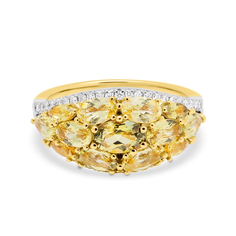 Celebrate the beauty of rare Australian gemstones with this 18ct yellow gold yellow sapphire and diamond ring, designed by Robert Cliff Master Jewellers. The centre features a unique cluster of oval, marquise, and pear cut yellow sapphires, arranged to create a graceful floating look. Two rows of micro claw-set brilliant cut diamonds flank the design, enhancing the sapphires with dazzling brilliance. Finished with a polished yellow gold band, this sapphire and diamond ring is a stunning choice for a statement dress ring or a treasured heirloom.