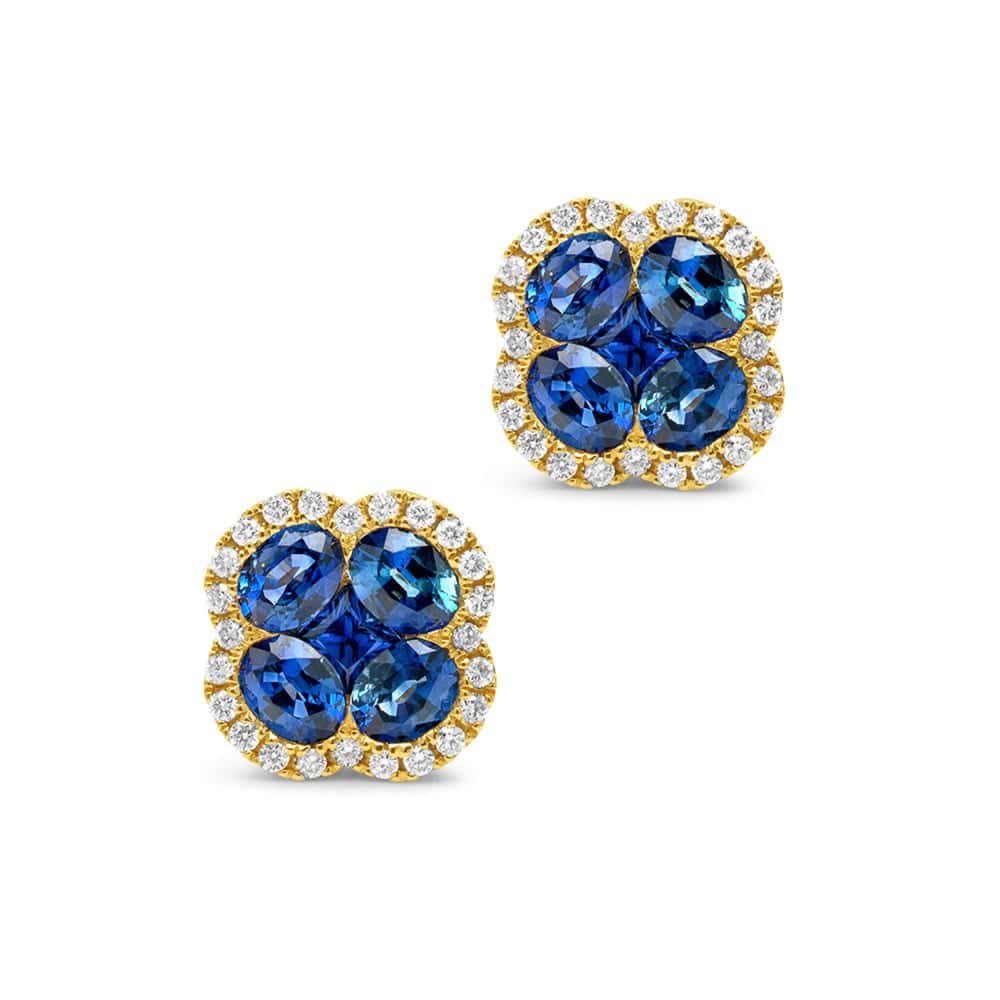 Charming and elegant, these 18ct yellow gold clover earrings feature invisibly set oval cut blue sapphires at their centre. Encircling each vibrant stone is a delicate micro claw-set halo of brilliant cut mined diamonds, adding refined sparkle. Finished with secure push-back posts and butterfly fittings, this exquisite pair is masterfully crafted by Robert Cliff Master Jewellers.