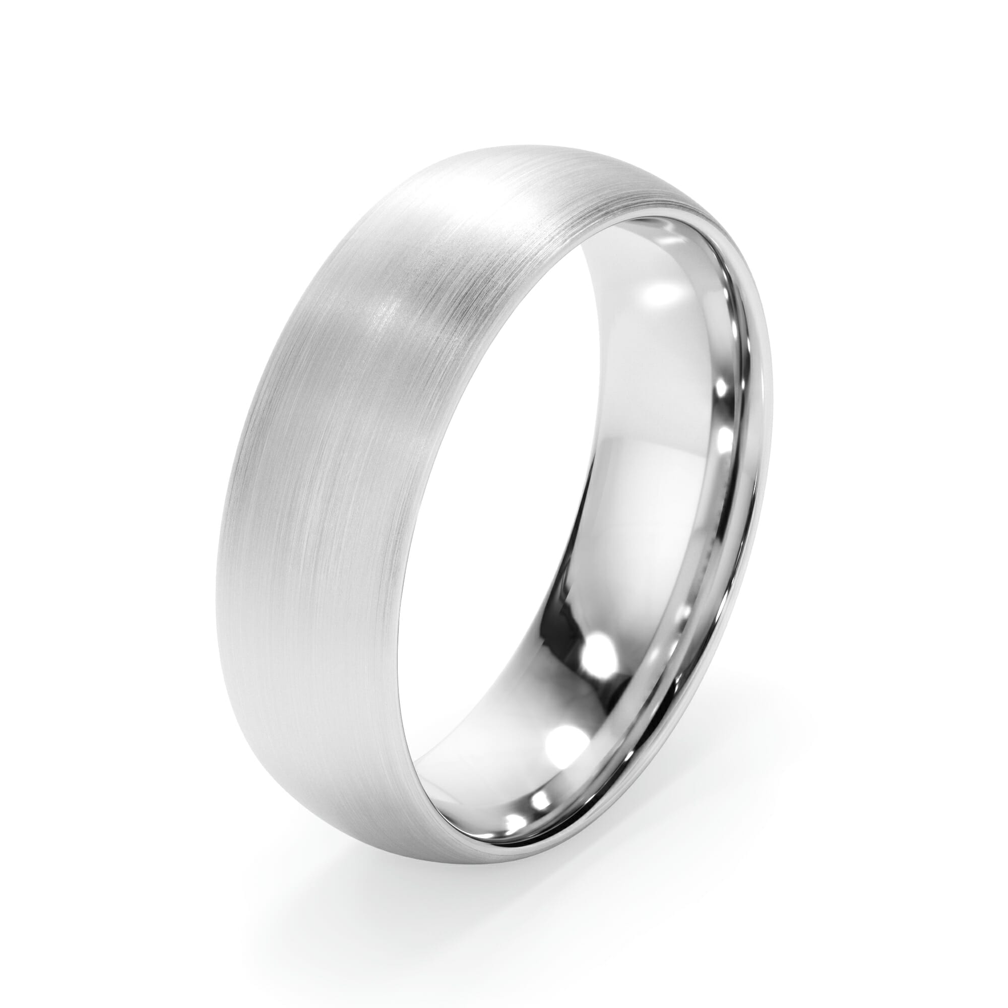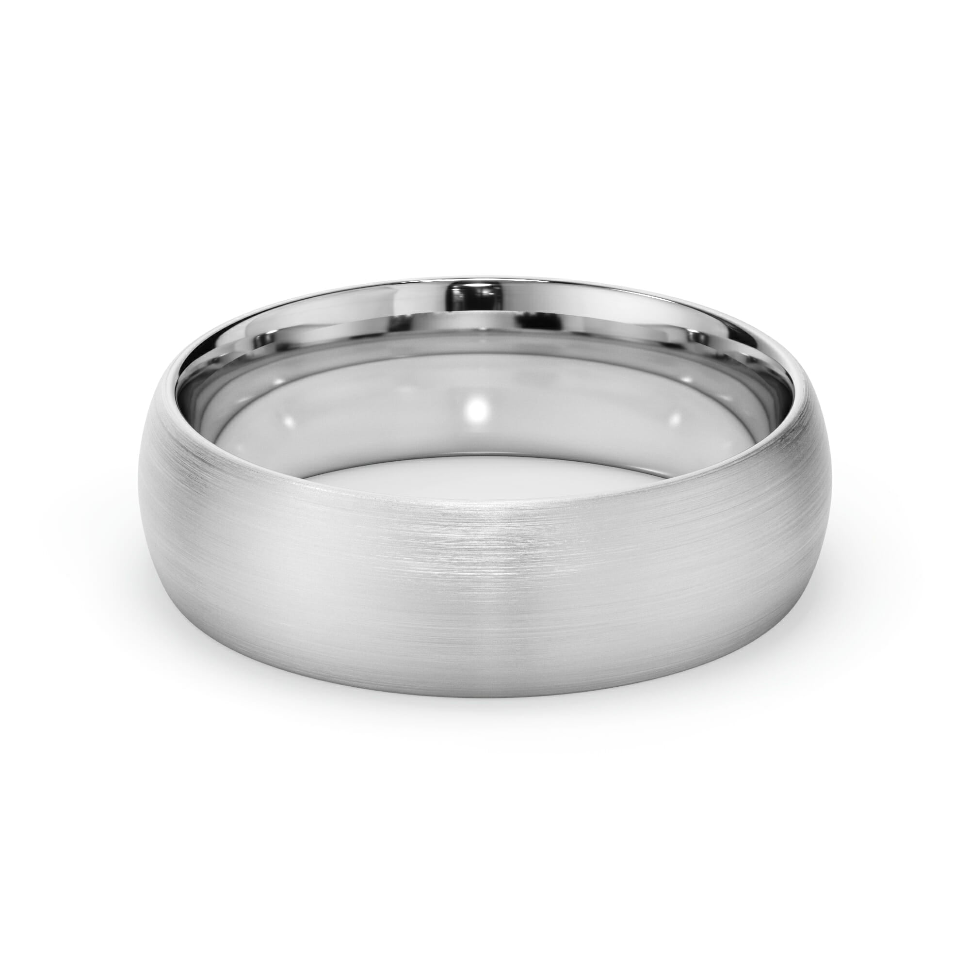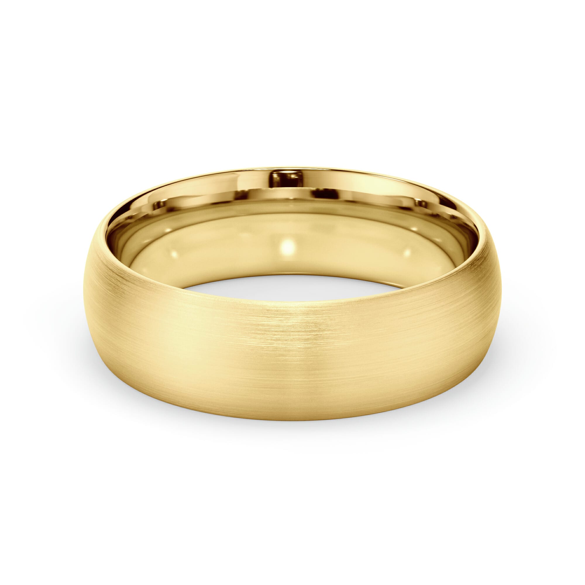 An elegant take on modern design, this 18ct gold ladies wedding ring features nine baguette cut mined diamonds set sideways for a unique linear sparkle. The 2.3mm wide band is finished with a high polish, adding a sleek and refined touch. This Classic 7mm Brushed Wedding Ring exudes timeless sophistication and elegance. Crafted with your choice of 9ct/18ct gold or platinum for an elegant finish, it features a rounded inner band for added comfort and subtle detailing, allowing you to cherish a timeless symbol of your love forever.