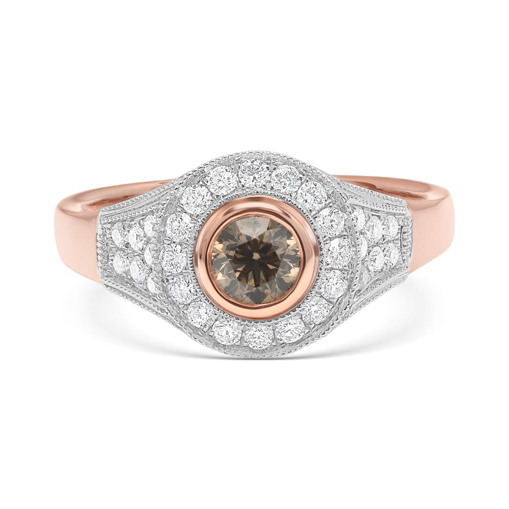 This elegant 9ct rose gold ring showcases a 0.40ct round Australian chocolate diamond, securely bezel-set in rose gold. Surrounding the centre stone is a white gold claw-set radiant halo of brilliant-cut mined diamonds. The contrast of warm rose gold with the rich chocolate diamond and sparkling white diamonds creates a refined balance of colour and brilliance.