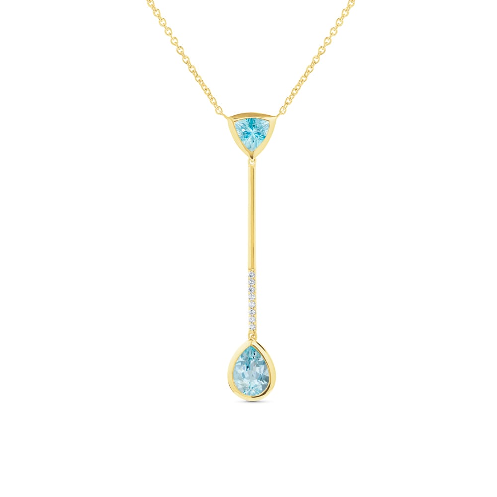 Crafted in 9ct yellow gold, this modern drop bar necklace features a vibrant trilliant cut blue topaz at the top, connected to a sleek, rounded vertical bar. Claw-set white sapphires add sparkle to the base of the bar, which flows into a beautifully faceted pear cut blue topaz. The graceful design creates a cascading effect of colour and brilliance. Suspended from a 45cm yellow gold trace chain and secured with a parrot clasp, this necklace is a sophisticated statement piece perfect for both day and evening wear.