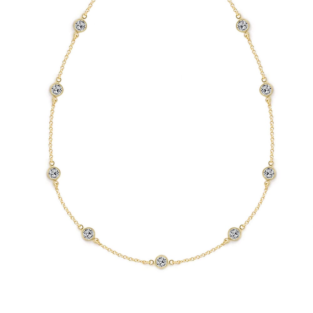 One 45cm diamond by the yard necklace. Crafted in 9ct yellow gold, this elegant piece features ten evenly spaced bezel set brilliant cut mined diamonds, each linked by a fine trace chain to create a timeless design. The necklace is finished with a bolt ring clasp and multiple adjustment rings to customise the length with ease. Beautifully made by Robert Cliff Master Jewellers.