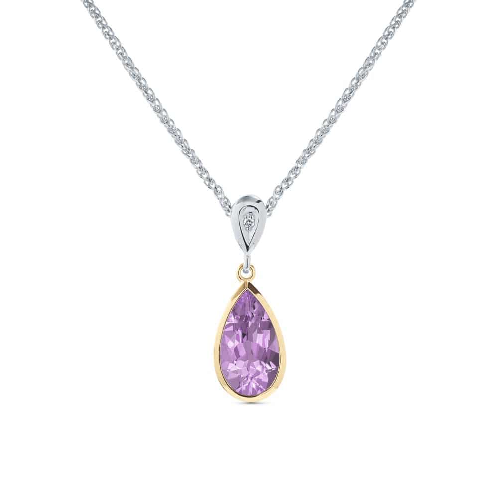 This elegant 9ct yellow and white gold necklace features a striking pear-cut purple amethyst, bezel-set in warm yellow gold at the base of the pendant. Above it, a sculpted teardrop-shaped white gold motif houses a claw-set brilliant-cut mined diamond, adding a subtle sparkle and refined contrast. The pendant is suspended from a 45cm wheat chain, secured with a classic parrot clasp, offering both durability and timeless elegance.