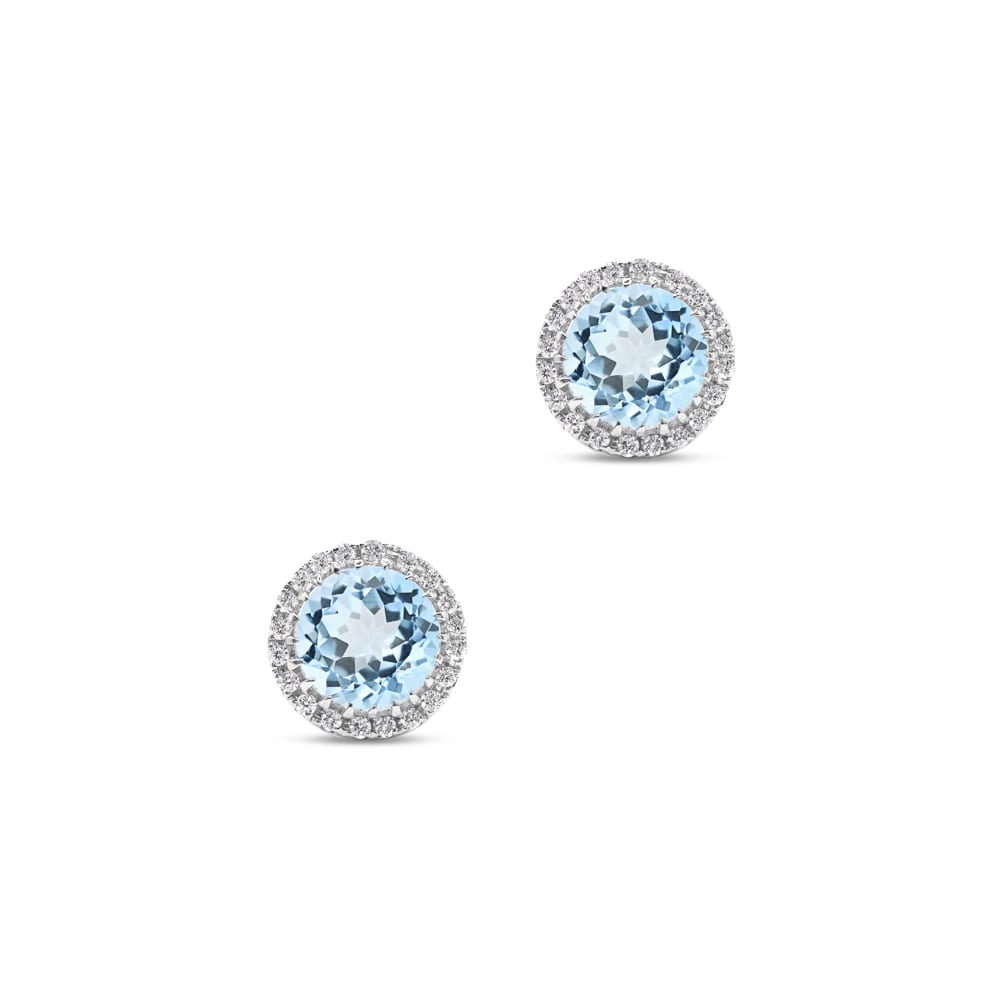Crafted in 18ct white gold, these timeless stud earrings feature post and butterfly fittings. Each earring showcases a round cut aquamarine at the centre, surrounded by a sparkling halo of claw set brilliant cut mined diamonds. A classic design with rich colour and elegant brilliance.