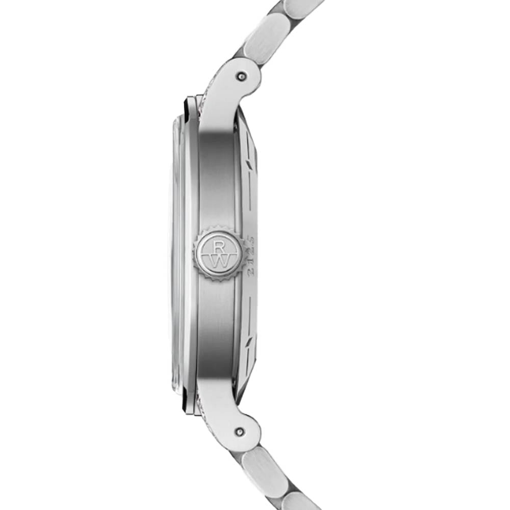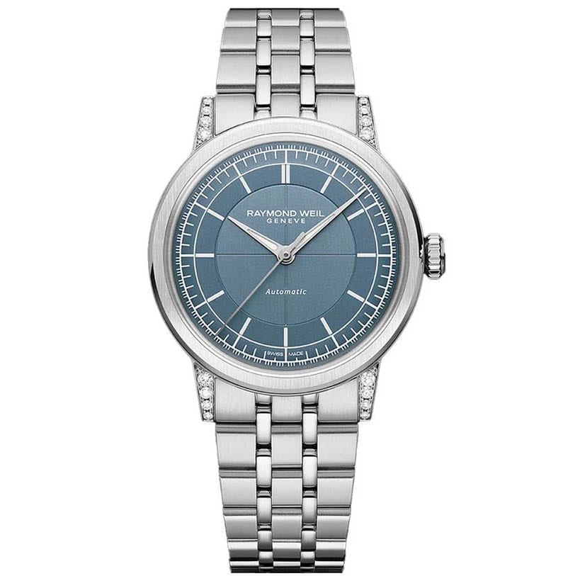 Honouring the heritage of Swiss horology, the Grand Vintage Automatic blends period charm with modern refinement. Beneath its vintage-inspired sapphire crystal glass-box, the denim blue sector dial features contrasting textures—a smooth hour track, snailed minute track, and brushed central area—for enhanced readability. Silver-toned hands with Super-LumiNova® glide effortlessly, while the 16 laboratory-grown diamonds (0.26 cts) on the lugs add a subtle sparkle of femininity. A sapphire caseback reveals the self-winding movement and RAYMOND WEIL’s signature W-shaped oscillating weight.
