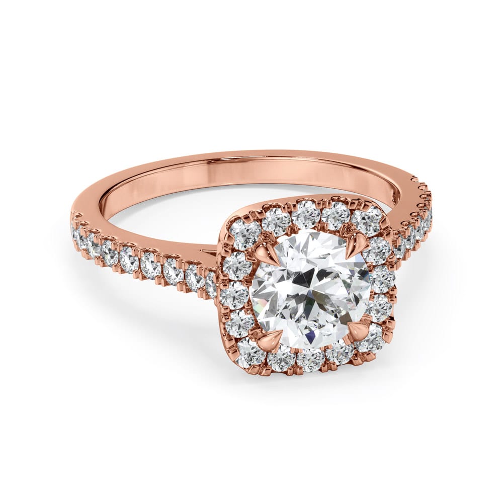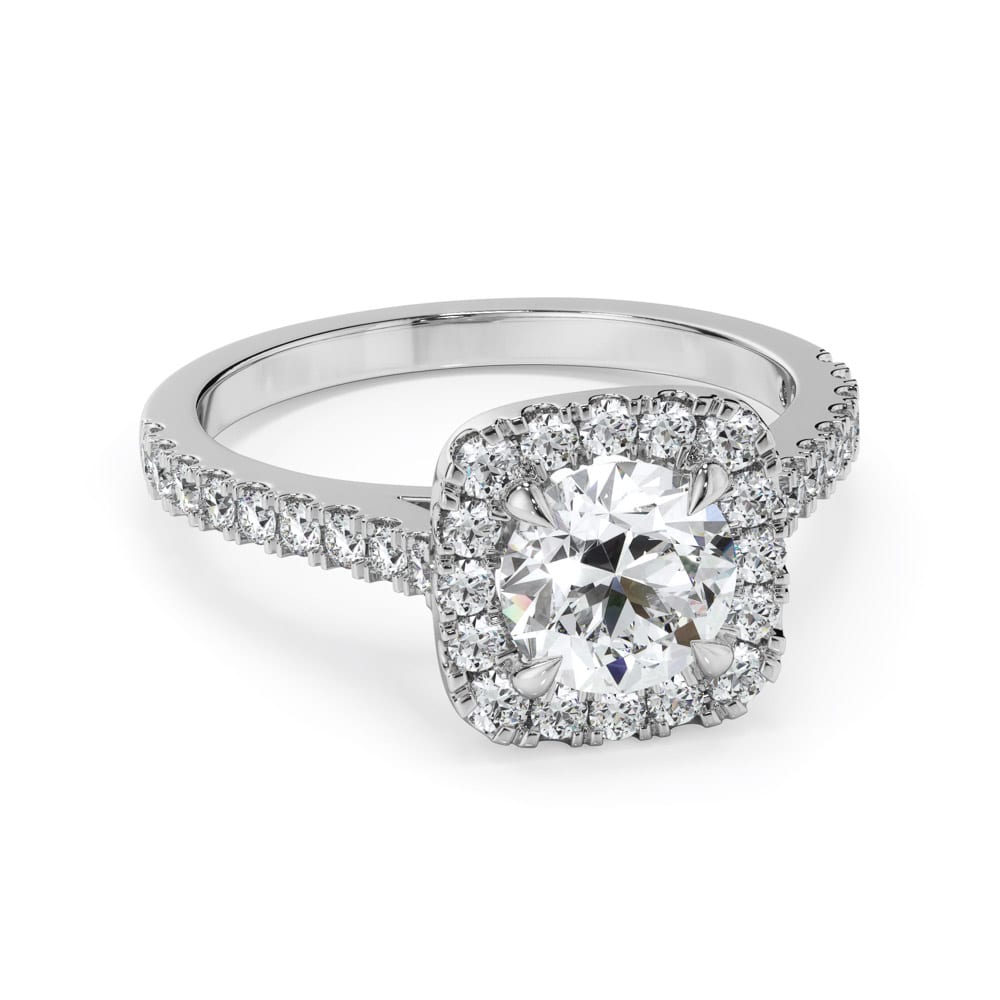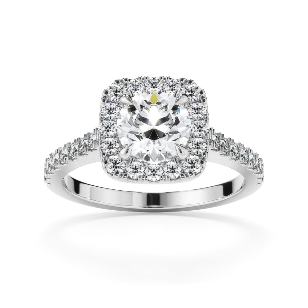 Timeless elegance meets radiant brilliance in this exquisite halo engagement ring. A stunning brilliant-cut diamond is securely four-claw set at the centre, encircled by a dazzling micro-claw set halo of brilliant-cut diamonds in a cushion shape that amplifies its sparkle. The brilliance continues along the shoulders, adorned with micro-claw set diamonds for a seamless, luminous effect. Designed with a high-polished band measuring 1.6mm in width expertly crafted by Robert Cliff Master Jewellers.