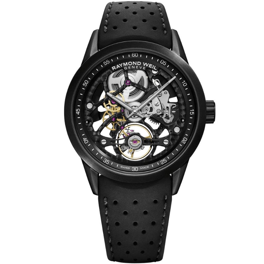 The Freelancer Calibre RW1212 Skeleton features a 42mm steel case with an in-house self-winding movement, a 41-hour power reserve, and a 28,800 vibrations per hour frequency. The dial is fully open, showcasing the balance wheel and craftsmanship. Paired with a black rubber strap for a modern touch, this timepiece reflects Raymond Weil’s commitment to innovation. Launched in 2007, the Freelancer collection celebrates the free-spirited man who embraces control and style with mechanical sophistication.