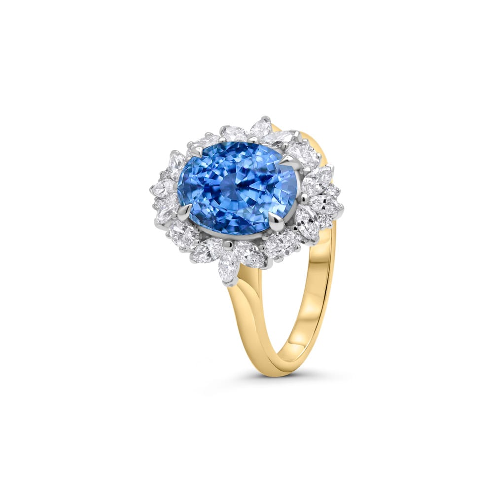 Celebrate rare beauty with this 18ct yellow and white gold Ceylon sapphire and diamond halo ring, expertly handcrafted by Robert Cliff Master Jewellers. At its heart lies a 3.12ct oval Ceylon sapphire, renowned for its vivid blue hue and secured in a classic four-claw white gold setting. Surrounding the sapphire is a snowflake-inspired halo of alternating marquise, brilliant cut, and oval cut diamonds, creating a spectacular display of brilliance. Finished with a high-polished yellow gold band, this sapphire and diamond ring is perfect as a luxury dress ring, anniversary gift, or treasured heirloom.