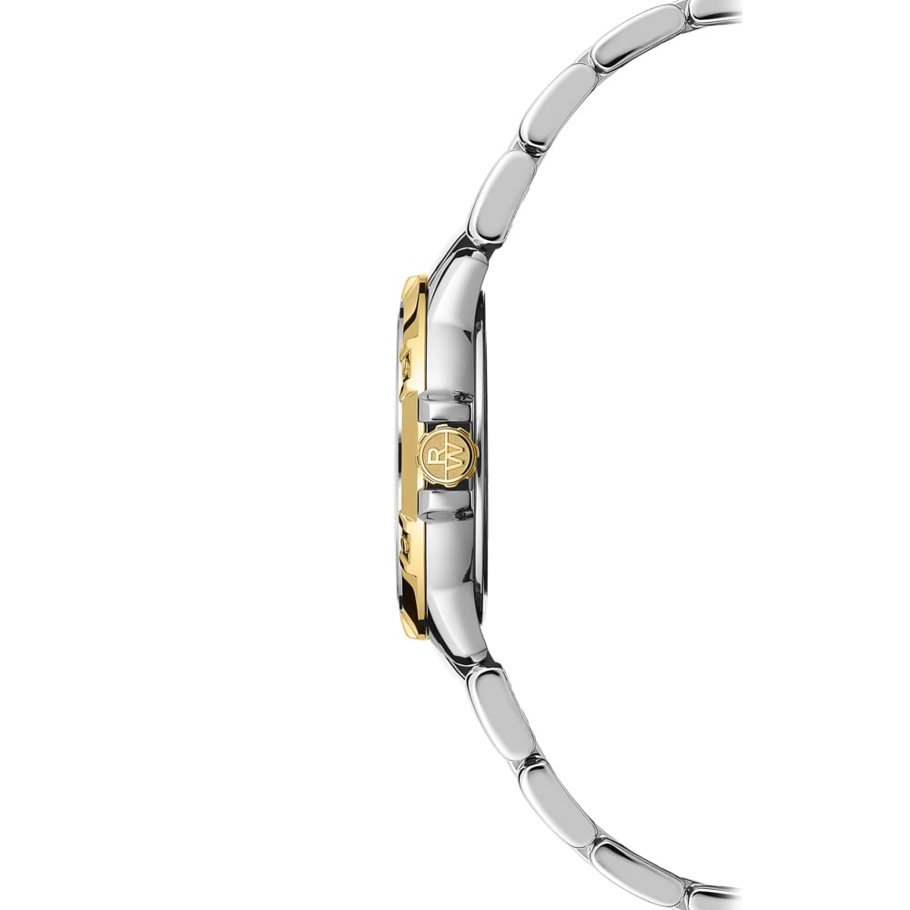 The Tango Ladies Quartz 30mm combines elegance with everyday versatility. Its white mother-of-pearl dial, adorned with Roman numerals and diamond accents, shimmers within a stainless steel case with yellow gold PVD plating. Water-resistant to 100 m, this refined timepiece embodies the perfect harmony of luxury and strength from the Tango collection.