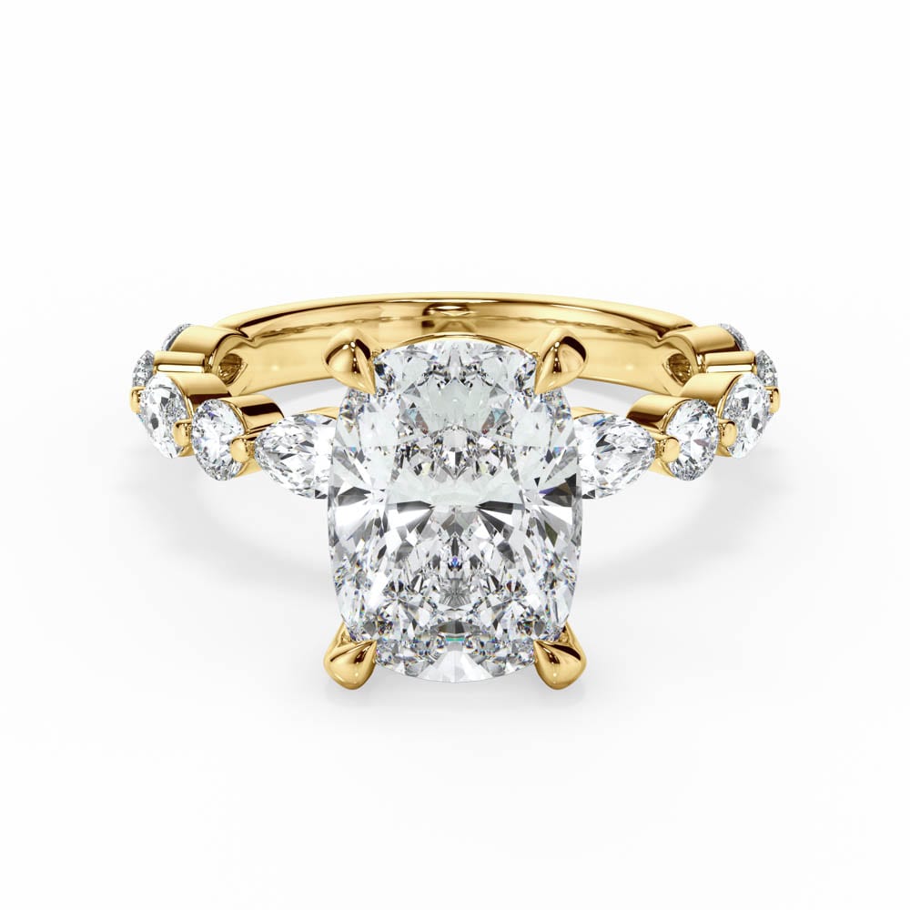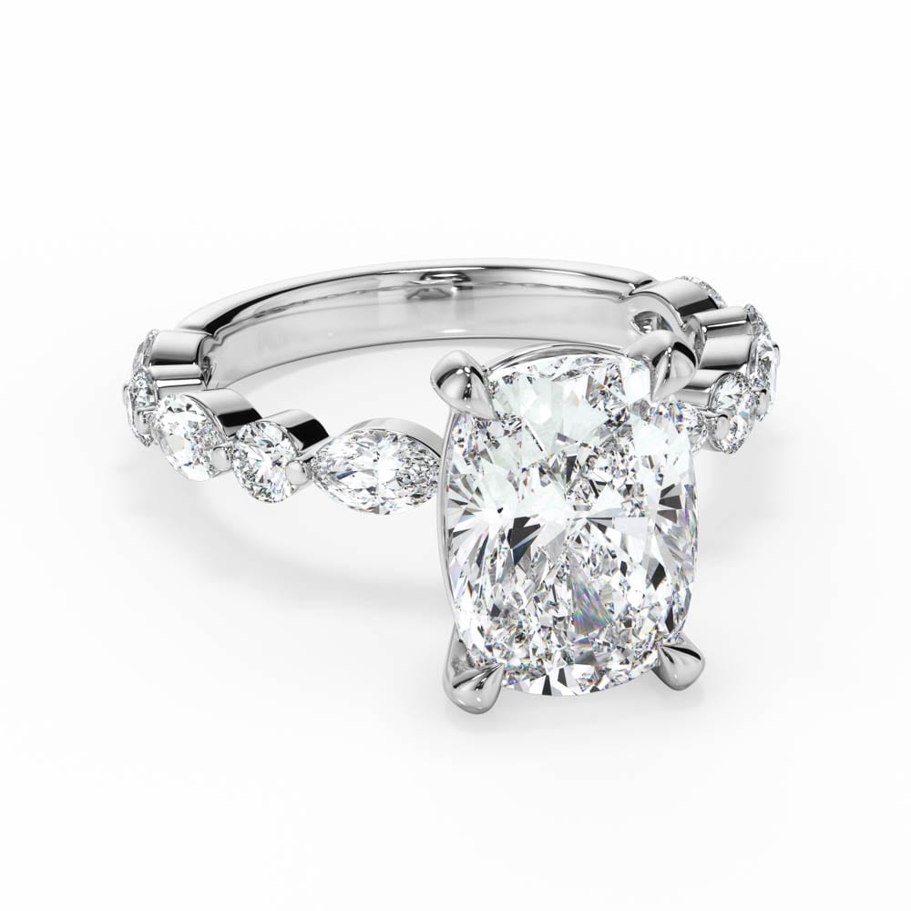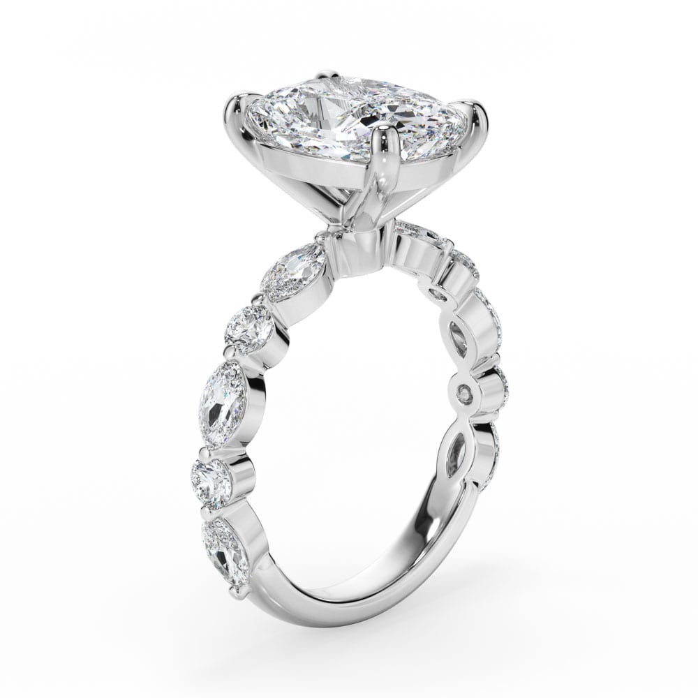 Cushion Cut Diamond Engagement Ring with Alternating Marquise and Brilliant Cut Accent Band