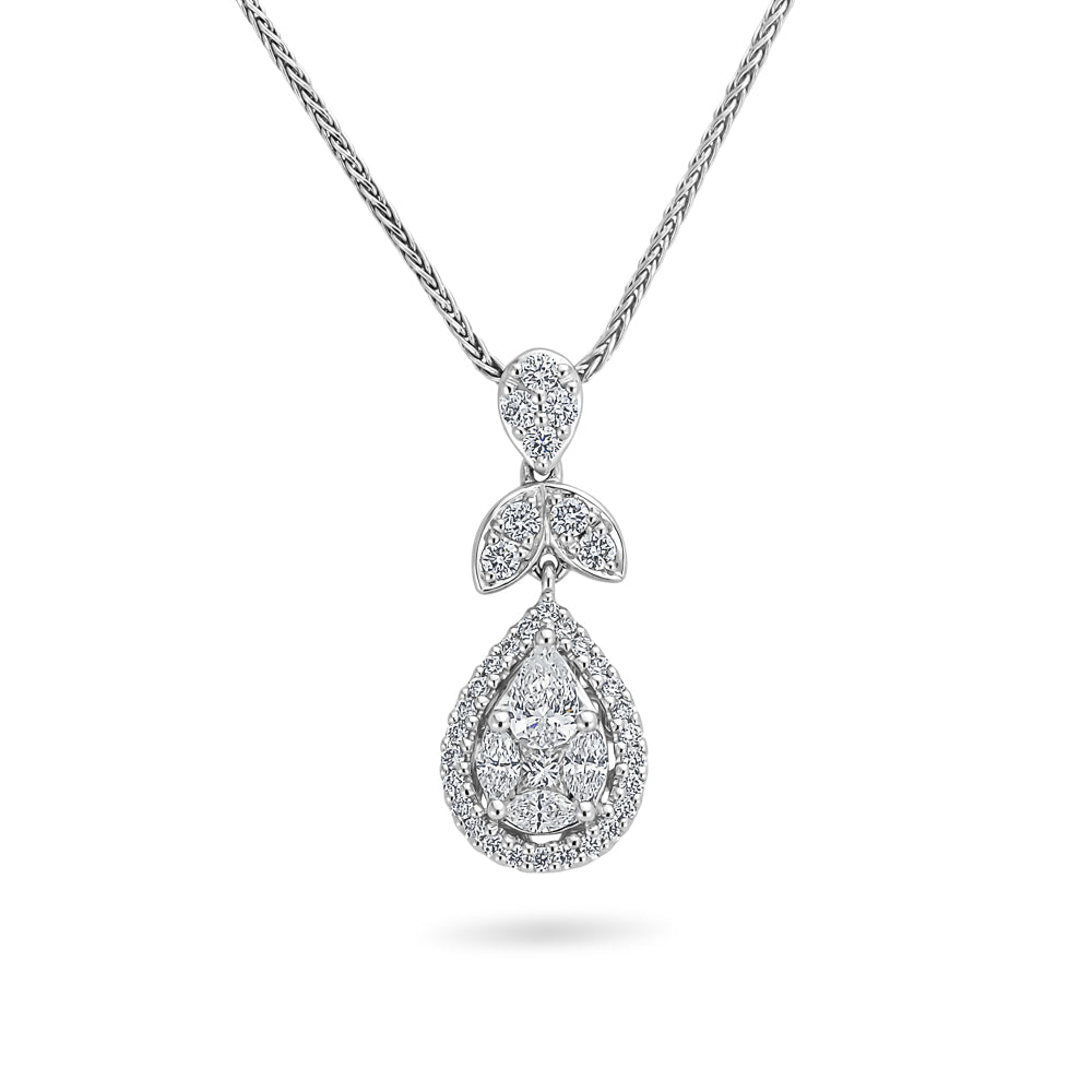 Crafted in 18ct white gold, this dazzling pendant showcases a graceful arrangement of marquise, pear, and brilliant cut mined diamonds. Designed in a fluid drop silhouette, it sparkles with every movement—blending timeless elegance with a modern edge.