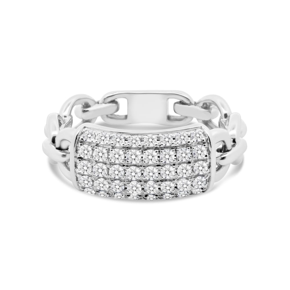 The diamond ring is crafted with high polish white gold, giving it a radiant and luxurious appearance. The ring features 4 rows of dazzling diamonds, adding a touch of sparkle and glamour to any outfit.\n\nDiamonds = 0.43ct