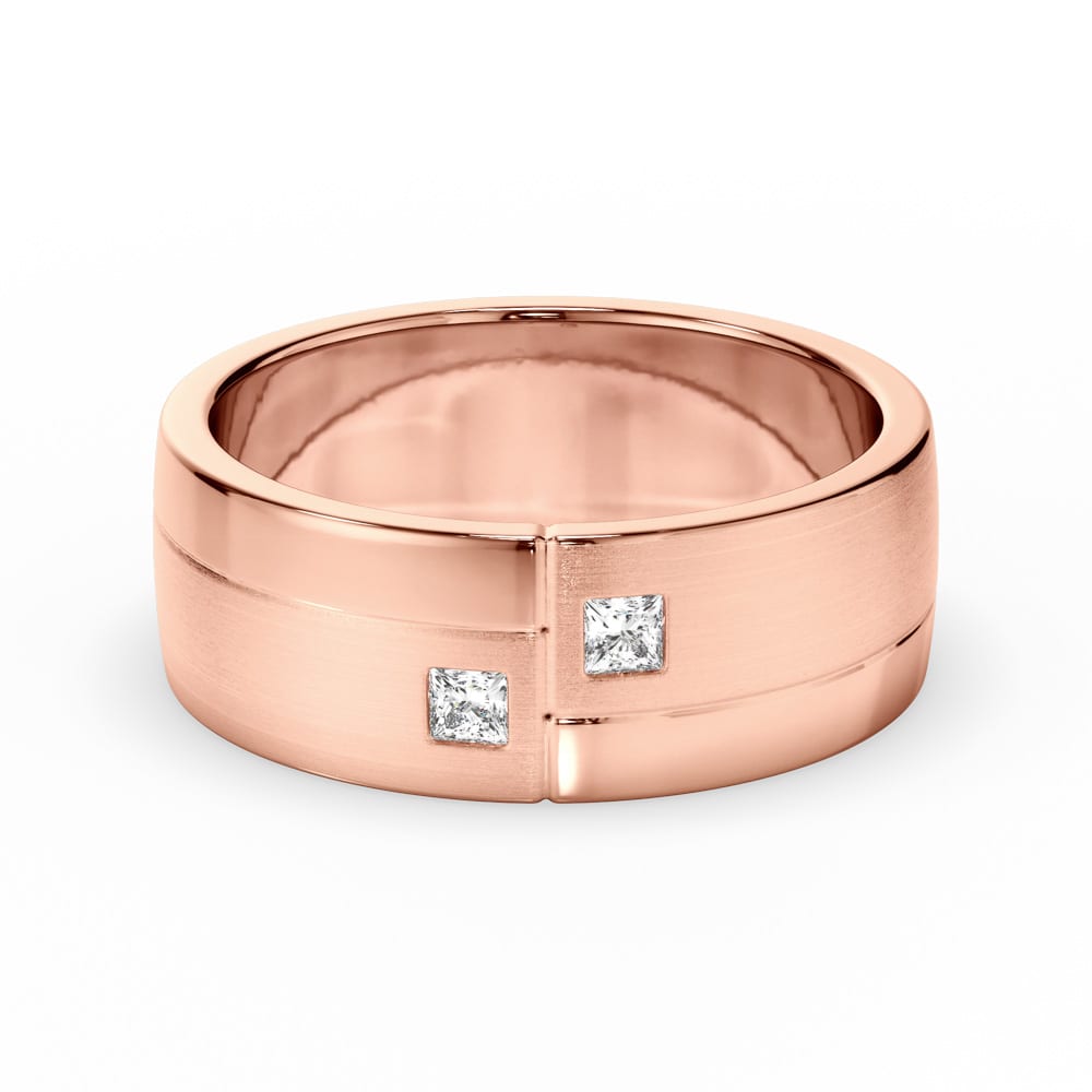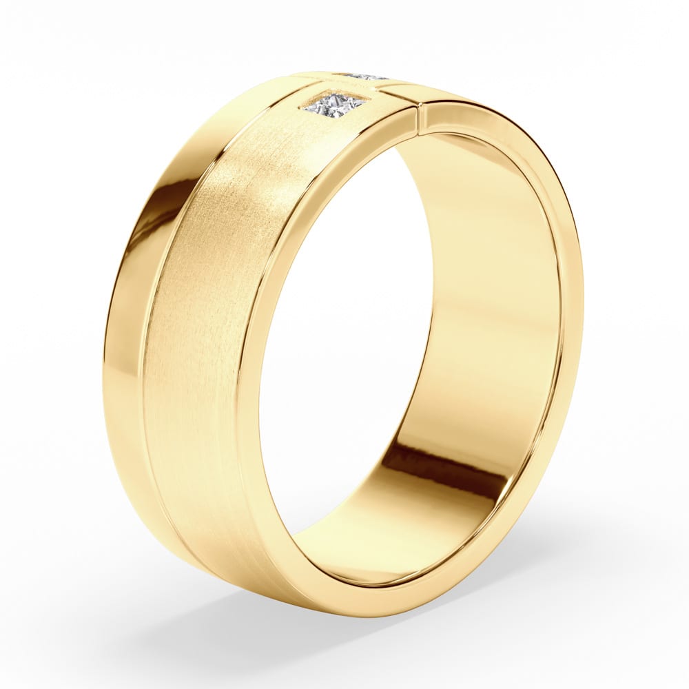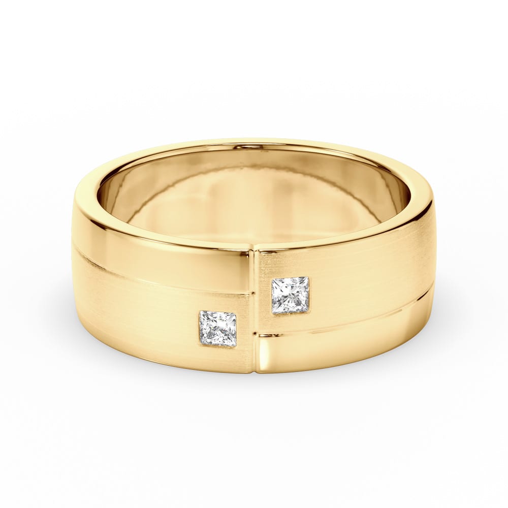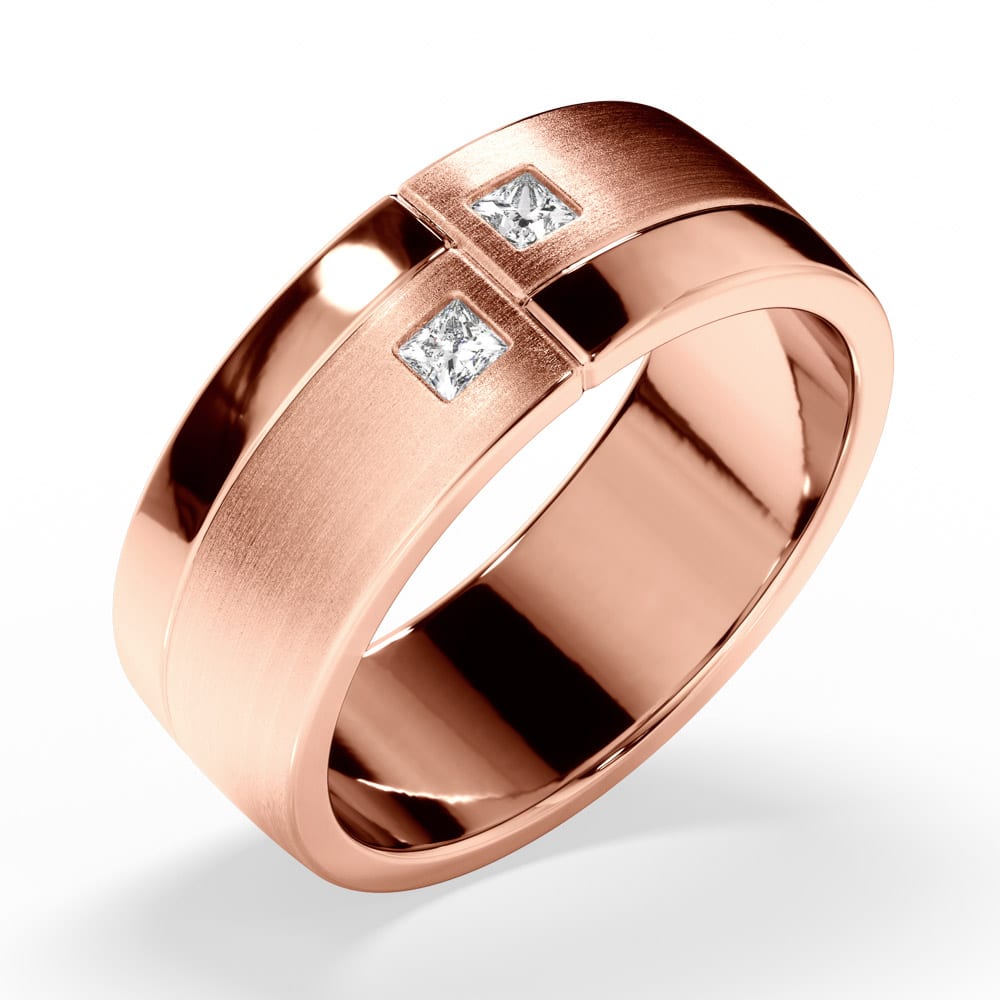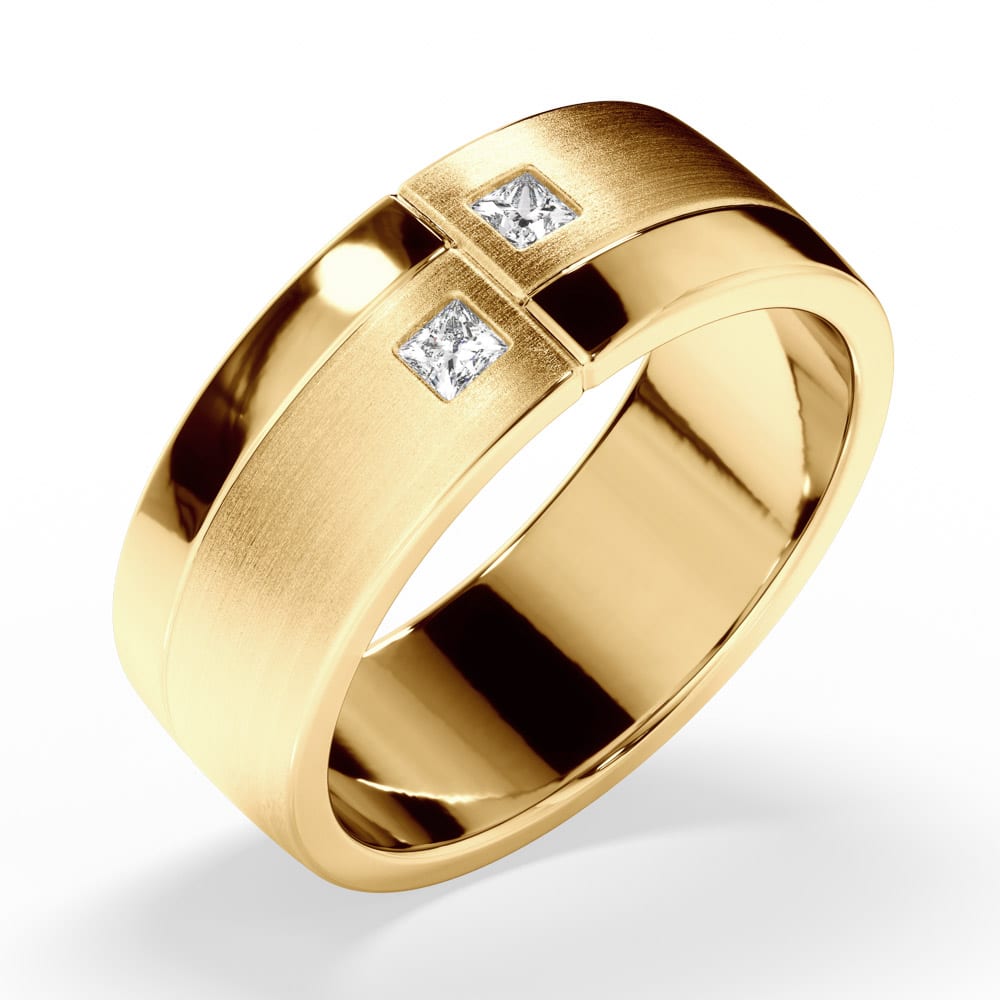 A bold men's ring, 8.00mm wide, featuring two hammer-set princess-cut diamonds for a refined touch of elegance. The alternating brushed and high-polished finish adds a striking contrast, showcasing the expert craftsmanship of Robert Cliff Master Jewellers.\n\nDiamonds = 0.14ct