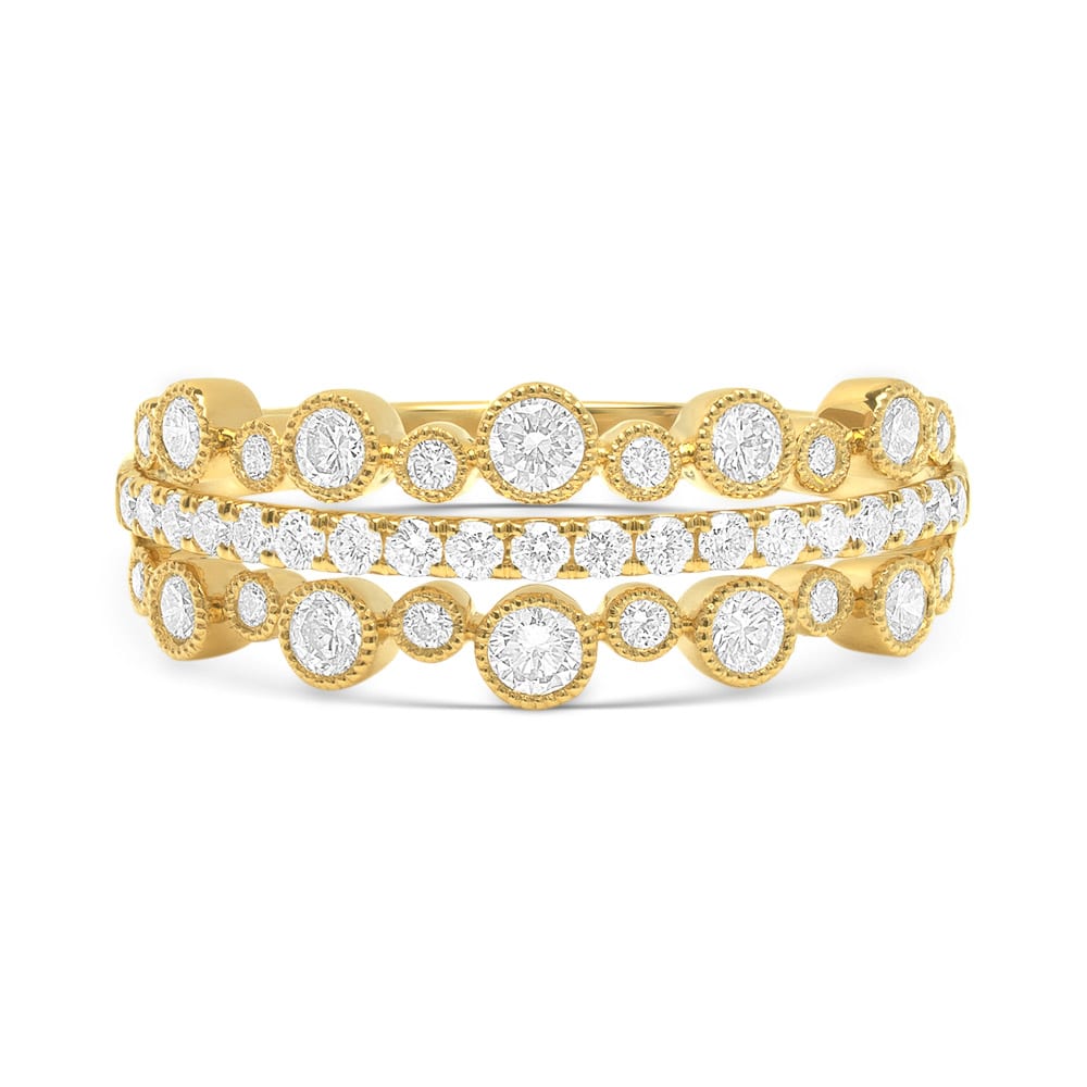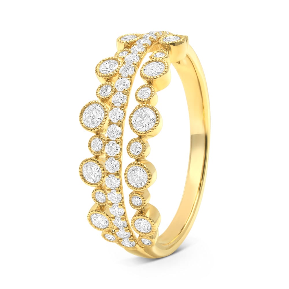 A refined design with vintage charm, this 18ct yellow gold diamond ring features a central row of claw-set brilliant cut mined diamonds. On either side, bezel-set brilliant cut mined diamonds graduate in size from large to small, each finished with a delicate milgrain edge for timeless detail. The high-polished yellow gold band completes this elegant creation, designed by Robert Cliff Master Jewellers.