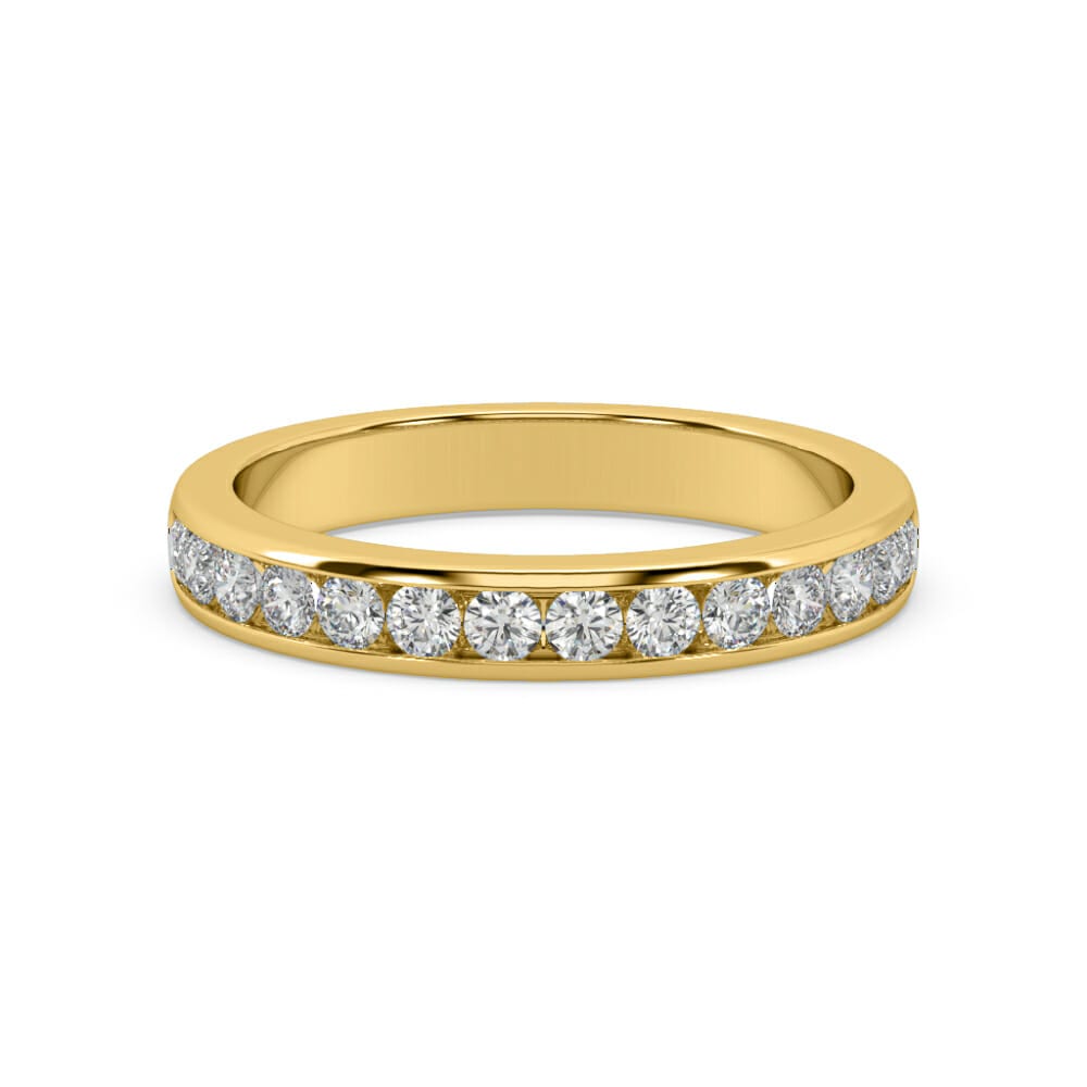 Crafted in radiant 18ct gold, this elegant ladies wedding ring features a row of seven channel set brilliant cut mined diamonds that deliver timeless sparkle and sophistication. The 3.00mm wide band is finished with a high polish for a sleek and refined look.