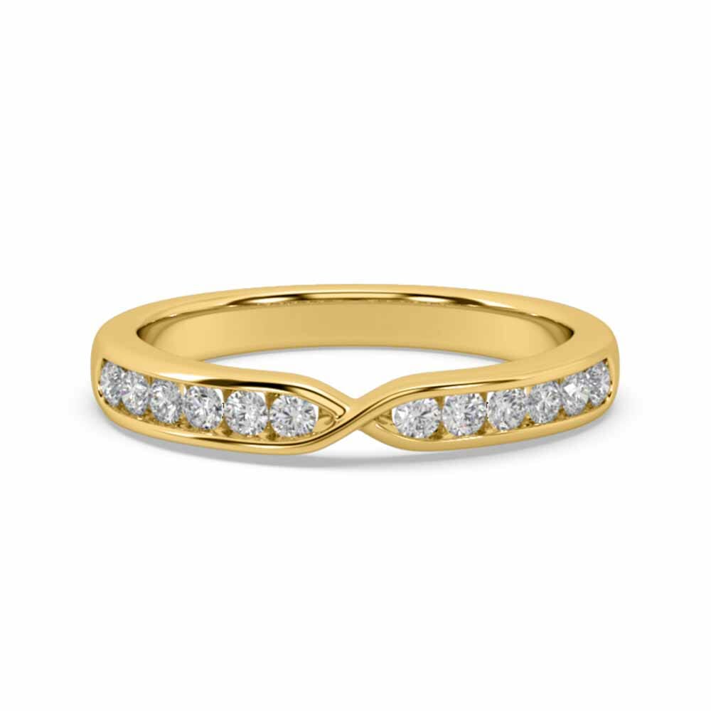 A timeless wedding ring crafted in 18ct gold, featuring a sleek central groove that adds modern elegance to its classic form. Brilliant cut mined diamonds are channel set across the band, creating a seamless sparkle. The high polished finish and 2.8mm width complete this refined design, perfect for everyday luxury.