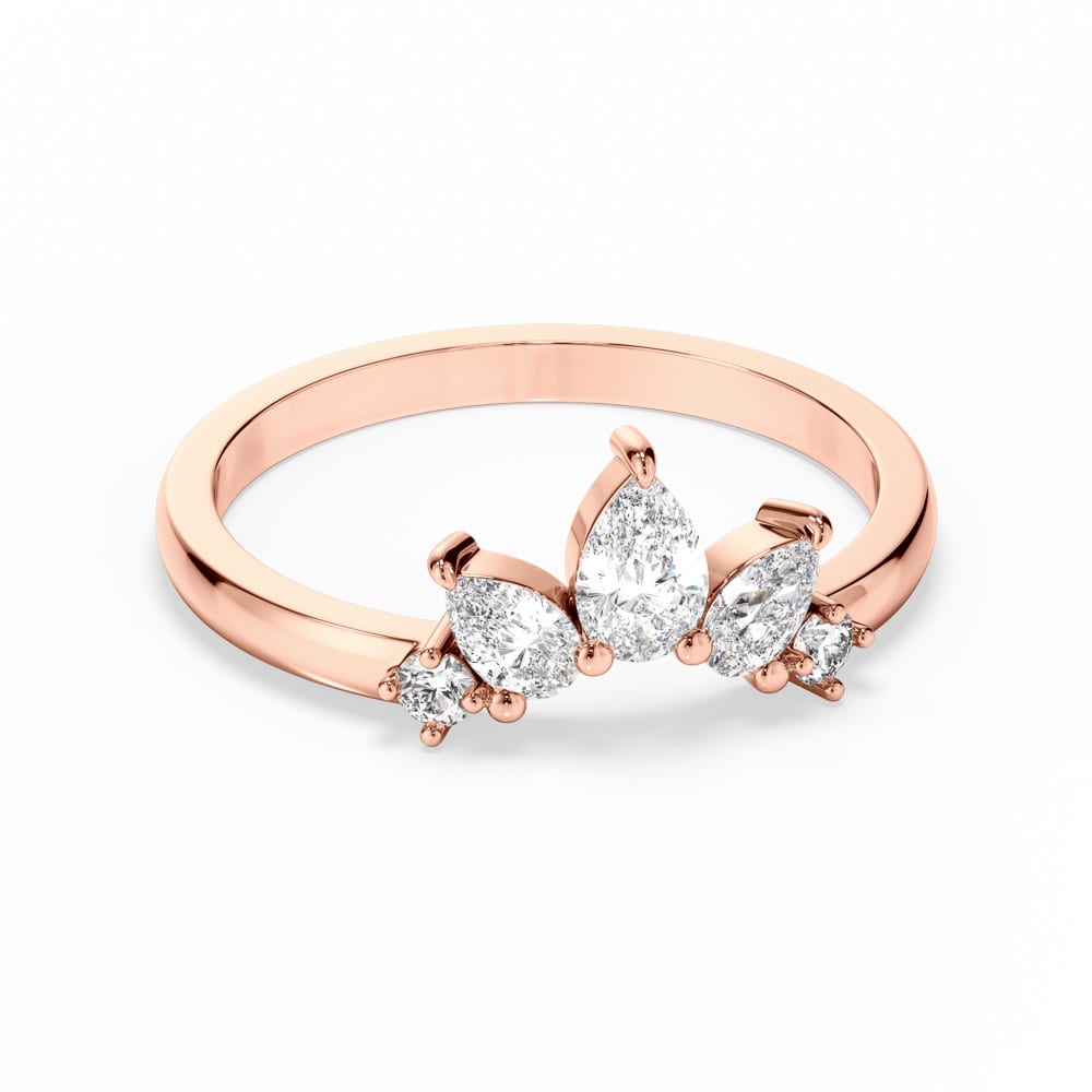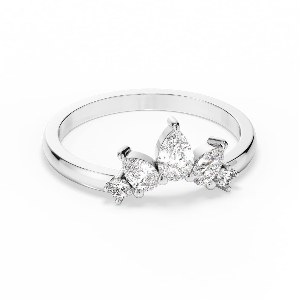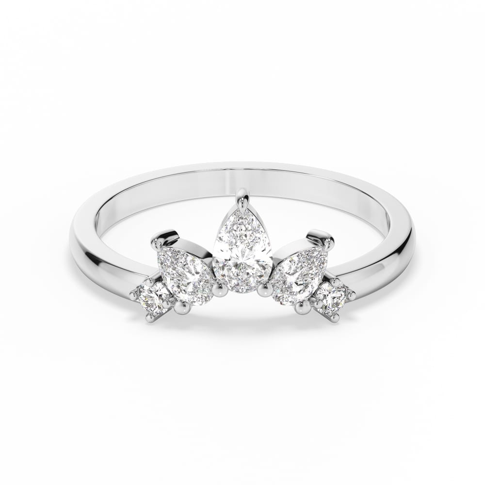 Crafted in a curved ‘crown’ design, this elegant ring features shared claw settings with a mix of pear cut and brilliant cut mined diamonds, reaching a setting height of 7mm. The high polished band measures 1.8mm in width, adding a sleek and graceful finish.