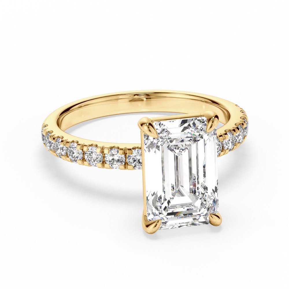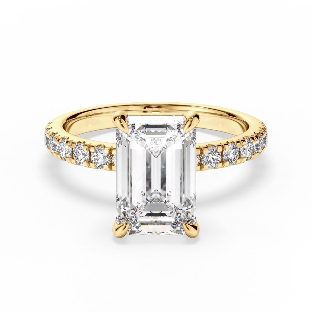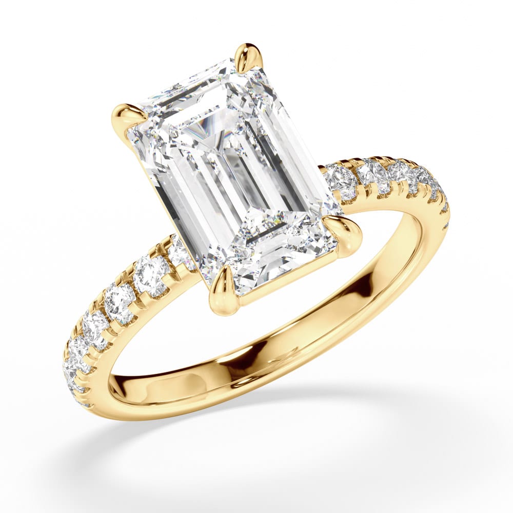 Exuding timeless elegance, this exquisite engagement ring features a breathtaking emerald-cut diamond, securely nestled in a refined four-claw setting at an 7.90mm height to enhance its brilliance. The 2.30mm band is adorned with meticulously claw-set brilliant-cut diamonds, adding a scintillating touch of sparkle. Designed with expert craftsmanship by Robert Cliff Master Jewellers.