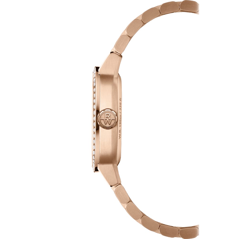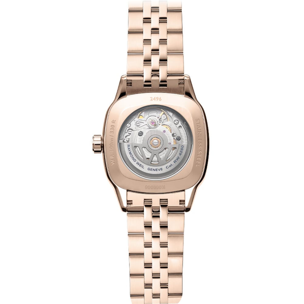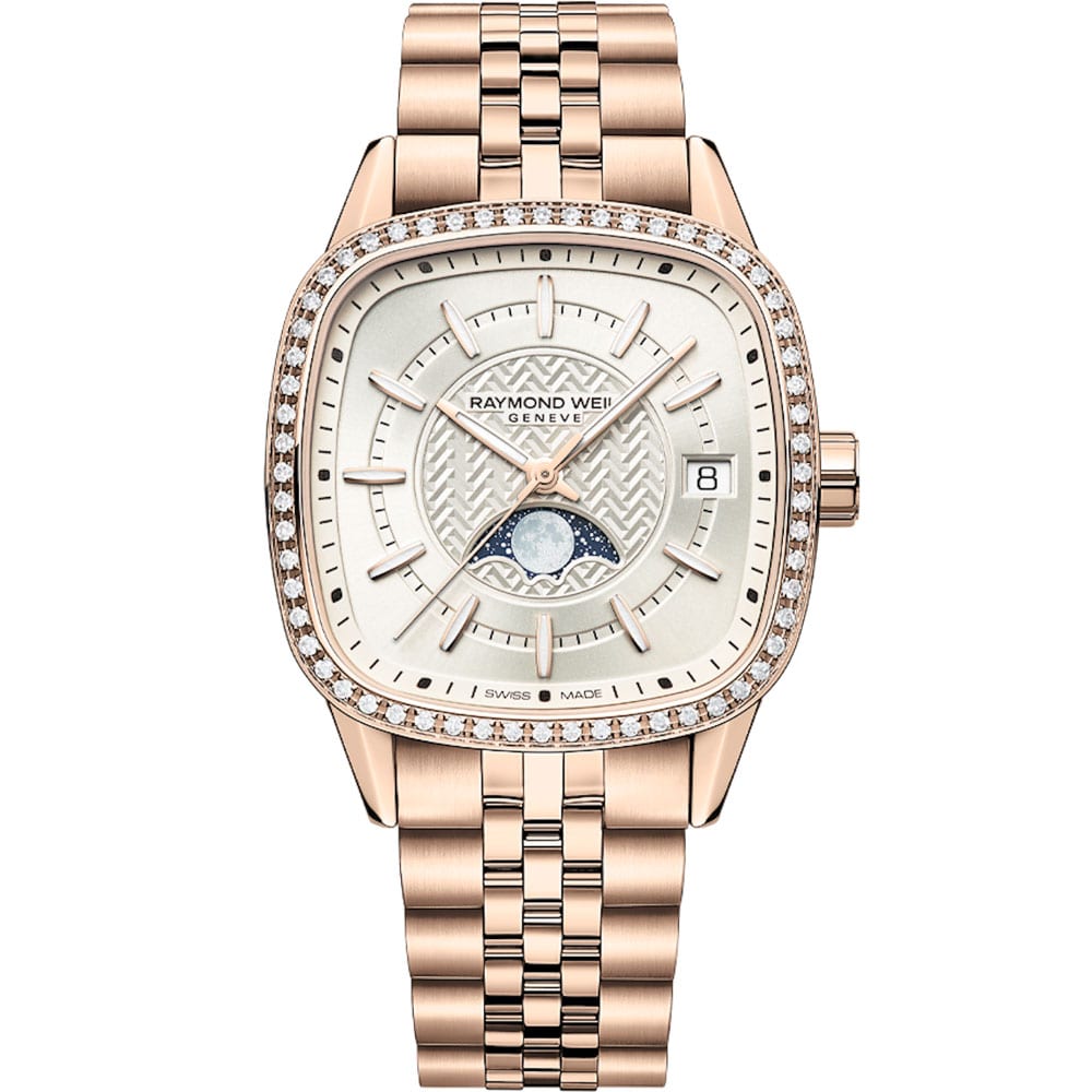 A bold reinterpretation of form, the Freelancer 34mm Automatic blends cushion-shaped elegance with modern detail. Its cream dial features rose gold-plated indexes, luminescent hands, a date display at 3 o’clock, and a moon phase complication inspired by NASA imagery. A central W-pattern motif adds depth and visual intrigue. Framed by a rose gold PVD stainless steel case set with 60 lab-grown diamonds (0.40ct), this timepiece houses a Swiss automatic movement with a 41-hour power reserve. Paired with a matching two-tone bracelet, it exemplifies RAYMOND WEIL’s fusion of tradition and innovation.