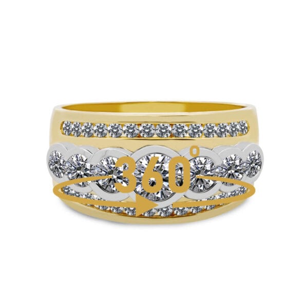 One 18ct yellow and white gold wide diamond ring featuring seven brilliant cut mined diamonds, each set in white gold half bezels across the centre. Flanking the main stones, additional brilliant cut mined diamonds are channel set for added sparkle and symmetry. The 18ct yellow gold band is softly rounded and finished with a high polish, creating a bold yet sophisticated look.