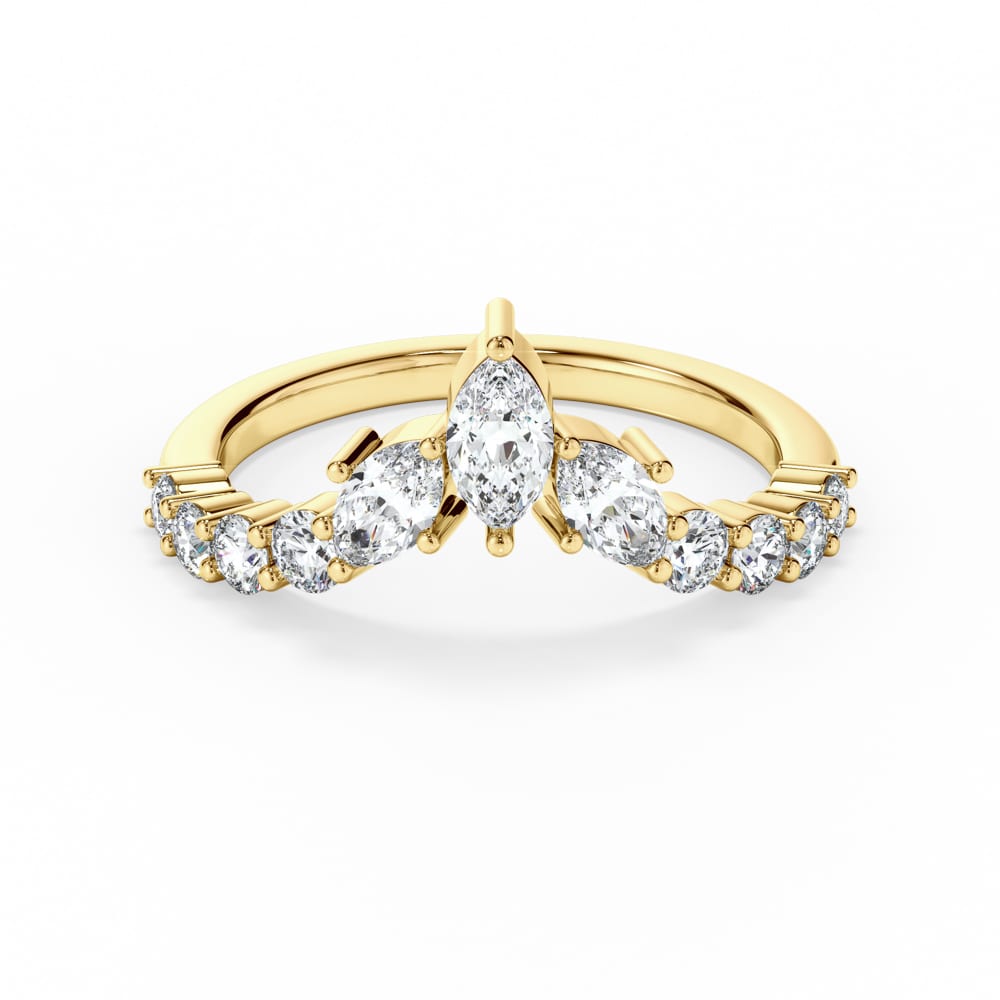 Artfully designed, this 18ct gold ladies wedding ring showcases a curved ‘crown’ arrangement of marquise and brilliant cut mined diamonds, each claw set to enhance their natural sparkle and shape. The 2.6mm wide band is finished with a high polish for a refined and elegant look.