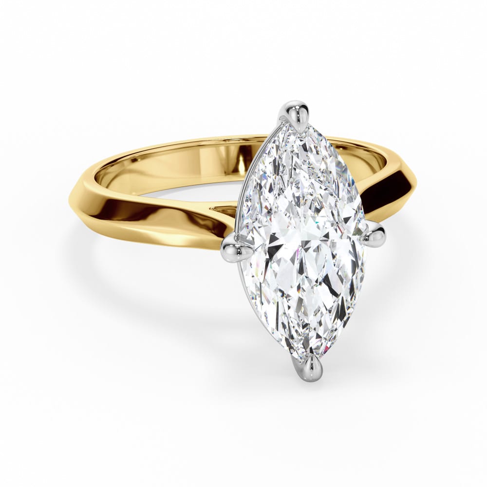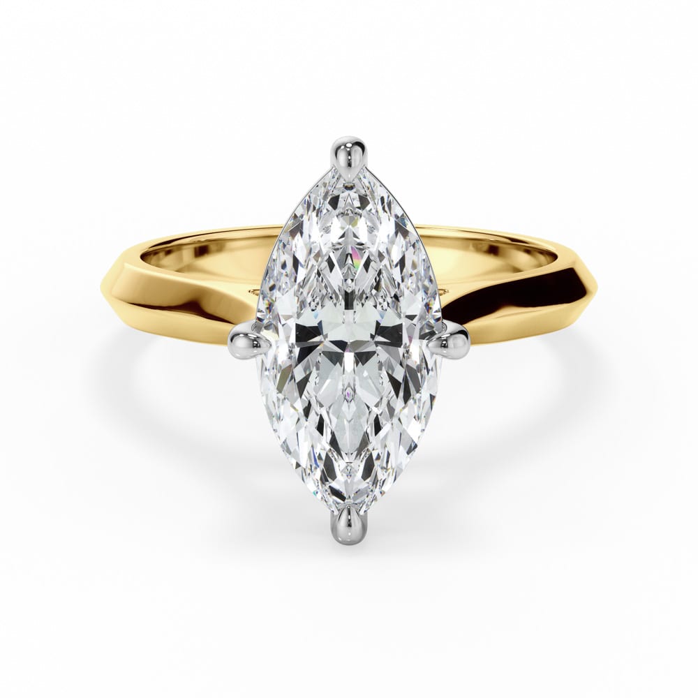 This 18ct white gold solitaire engagement ring features a striking marquise cut diamond, elegantly four claw set in white gold for a stunning contrast. The high polished 2.6mm yellow gold knife edge band adds a sleek and modern touch, complemented by a 7.5mm setting height. Expertly crafted by Robert Cliff Master Jewellers.