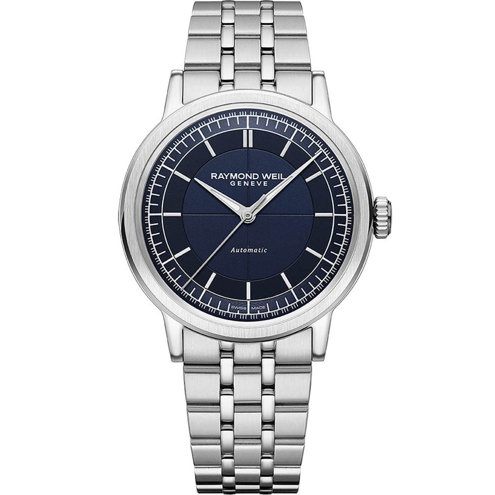 Blending vintage charm with modern refinement, the Millésime Automatic showcases a beautifully textured blue sector dial beneath a sapphire crystal glass-box. Silver-toned hands with Super-LumiNova®, along with a smooth hour track, snailed minute track, and brushed centre, enhance both readability and elegance. A satin-brushed bezel contrasts with polished bevels, while the sapphire caseback reveals the self-winding movement and signature W-shaped oscillating weight. Paired with a 5-row stainless steel bracelet or a leather strap with W-stitching, this neo-vintage timepiece embodies RAYMOND WEIL’s heritage of precision and timeless design.