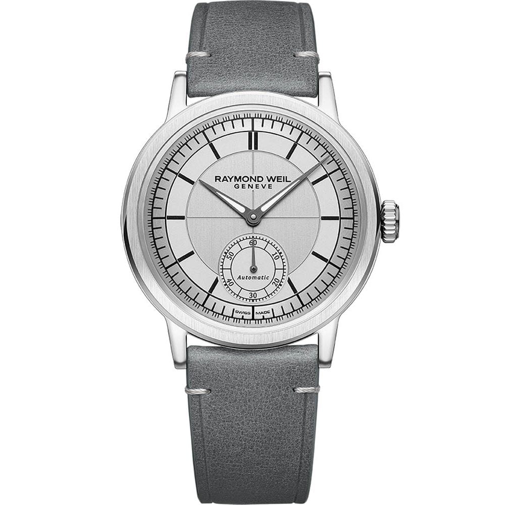 The Millésime Automatic collection blends vintage elegance with modern craftsmanship, honouring the rich traditions of Swiss watchmaking. Beneath a sapphire crystal glass-box, the sector dial showcases contrasting textures—a smooth hour track, snailed minute track, and vertically brushed centre—enhancing depth and readability. Silver-toned hands with Super-LumiNova® ensure clarity, while a 6 o’clock small seconds display adds refined detail. A satin-brushed bezel, contrasted with polished bevels, complements the sapphire caseback, revealing the self-winding movement and signature W-shaped oscillating weight. Paired with a genuine calf leather strap featuring W-stitching, the Millésime collection is a grand vintage interpretation of RAYMOND WEIL’s horological excellence.