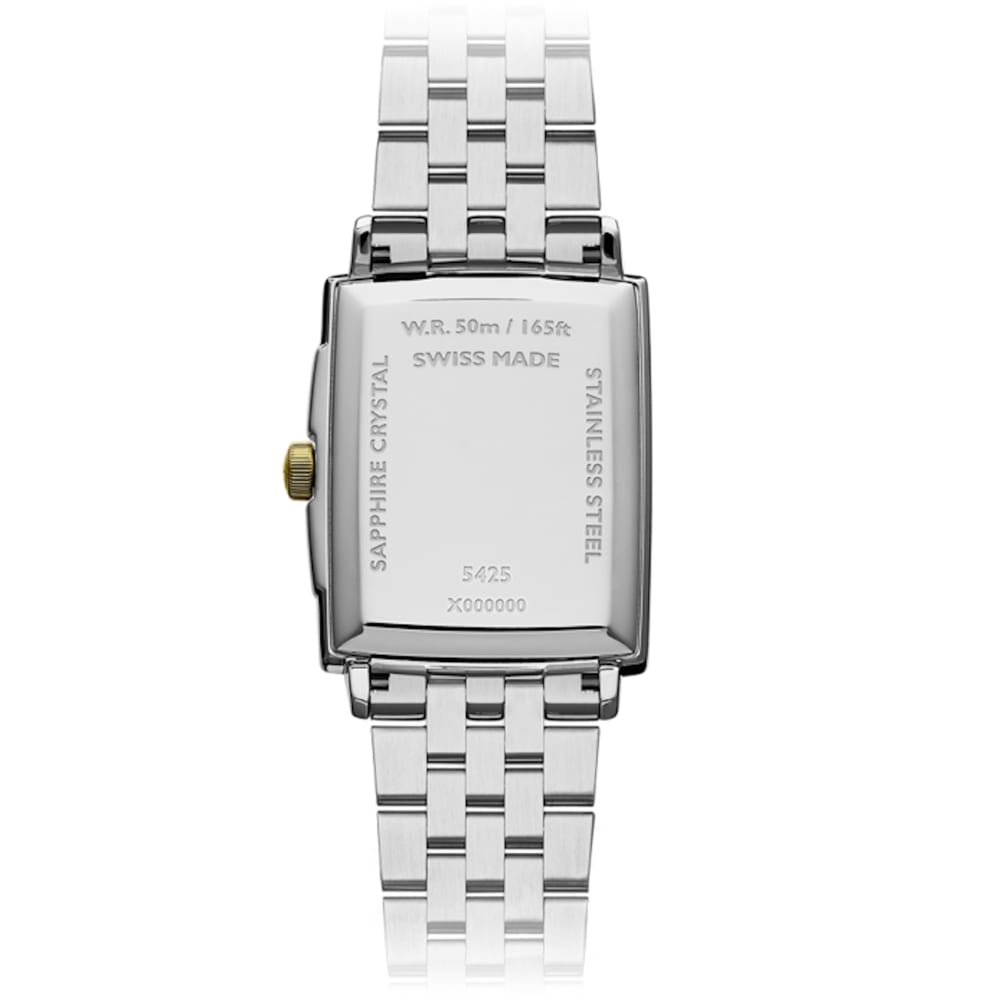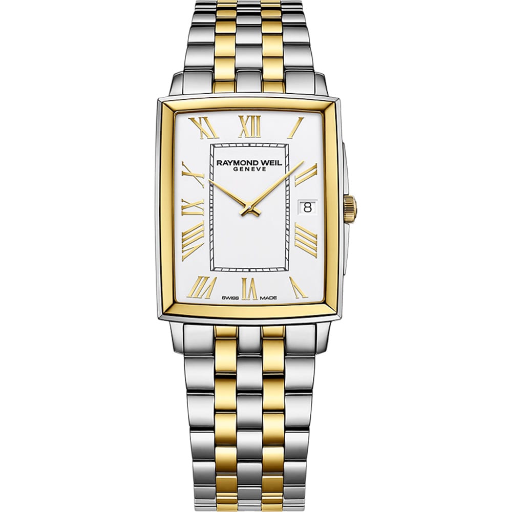 A timeless blend of elegance and precision, the Toccata men’s watch features a sleek rectangular stainless steel case with yellow gold PVD plating. The sophisticated white dial, adorned with Roman numeral markers and a 3 o’clock date window, enhances its refined charm. Powered by a precise quartz movement, this watch embodies RAYMOND WEIL’s dedication to Swiss horology, tradition, and artistic heritage—perfect for those who appreciate classic sophistication.