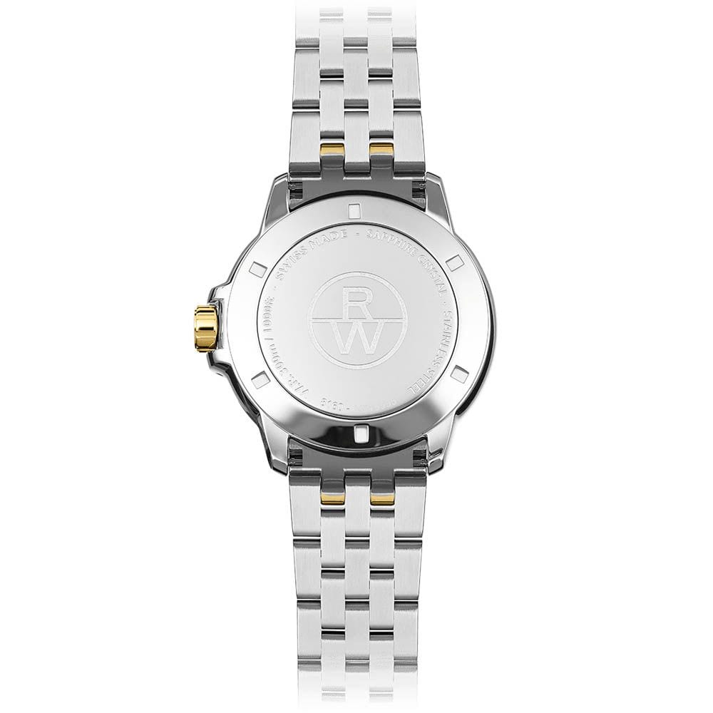 Blending refined style with durability, the Tango Classic Men’s Two-Tone 41mm watch features a stainless steel case with gold PVD plating, a sophisticated white dial, and gold-plated Roman numeral markers. A date window at 3 o’clock ensures effortless timekeeping. Powered by a precision quartz movement, this timepiece is water-resistant up to 1000 feet and features a scratch-resistant surface, making it ideal for any occasion. With its distinctive six-screw bezel, the Tango collection embodies RAYMOND WEIL’s signature craftsmanship, balancing classic elegance with modern functionality.