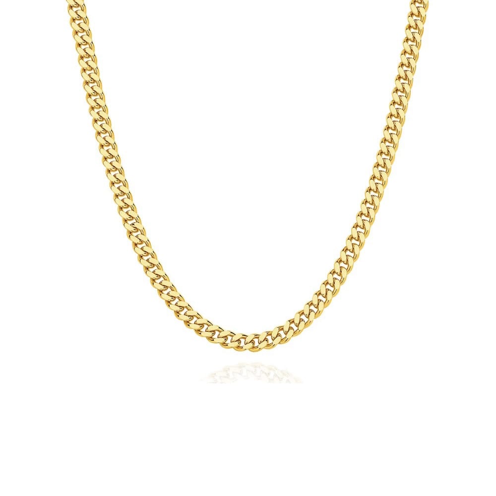 Crafted in solid 9ct yellow gold, this 55cm men’s necklace features a bold 4mm diamond cut curb link design. Each link is precision-faceted to reflect light with striking brilliance, creating a sophisticated finish that stands out. With its substantial weight and expert craftsmanship, this timeless piece combines strength, durability, and enduring masculine elegance.