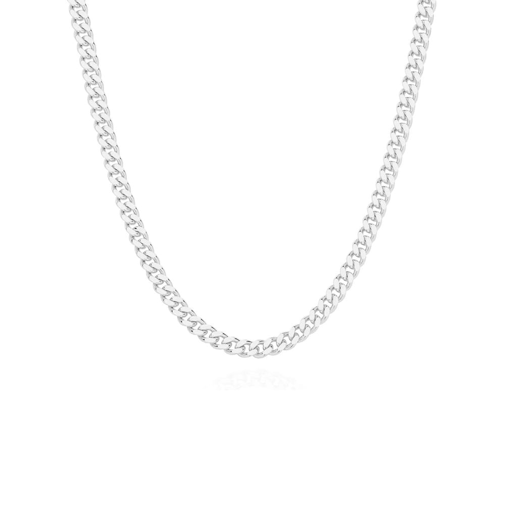 Crafted in solid 18ct white gold, this 55cm men’s necklace features a bold 4mm diamond cut curb link design. Each link is precision-faceted to reflect light with striking brilliance, creating a sophisticated finish that stands out. With its substantial weight and expert craftsmanship, this timeless piece combines strength, durability, and enduring masculine elegance.