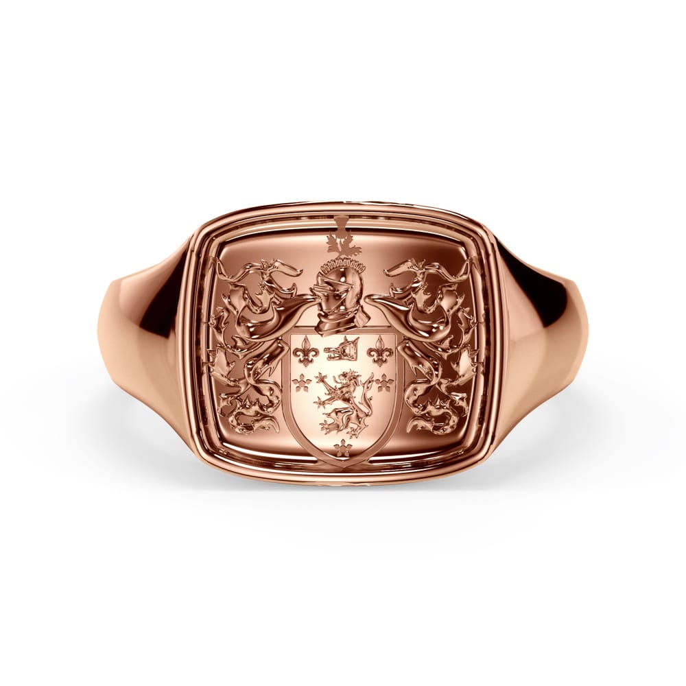 Presenting our exquisite 18ct rose gold signet ring, featuring a distinguished rectangular table top measuring 15.00 x 13.00mm — the perfect canvas for your personalised family crest engraving. The band is gracefully rounded and finished with a high polish, offering timeless sophistication.\n\nFollowing your order, our team will be in touch via email to confirm and finalise your engraving details, ensuring your piece is crafted to reflect your legacy.\n(Price includes engraving)